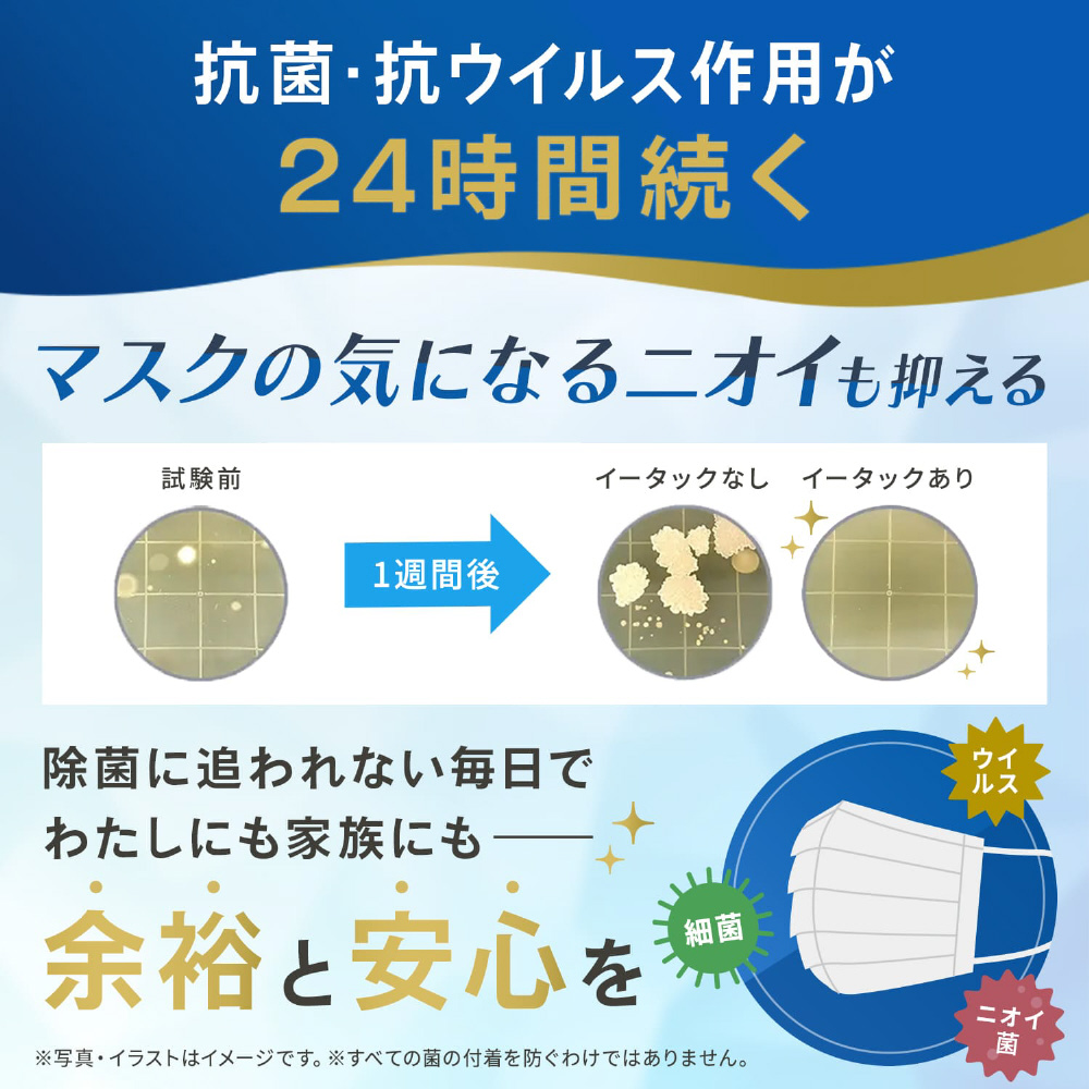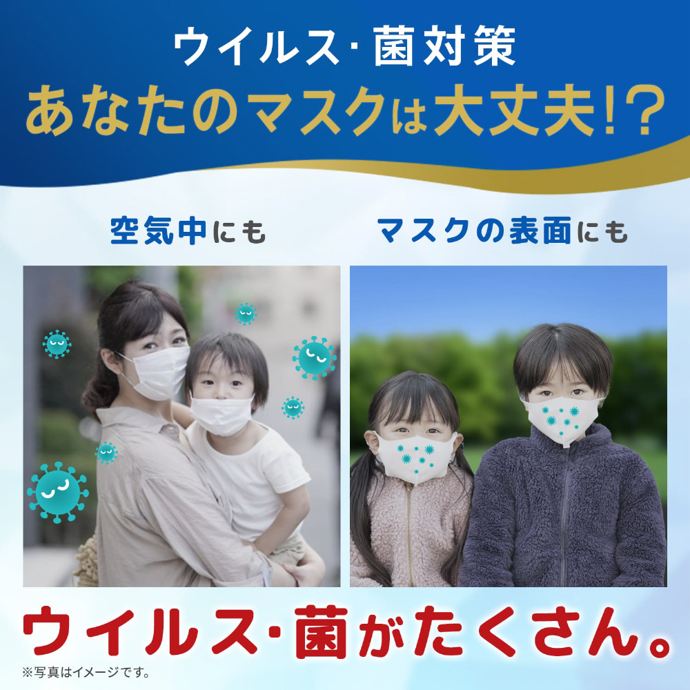 ウイルス菌を除去、抗菌作用が24時間持続。マスク着用前にスプレーするだけで、ウイルスや菌のマスクへの付着を24時間防いでくれます。