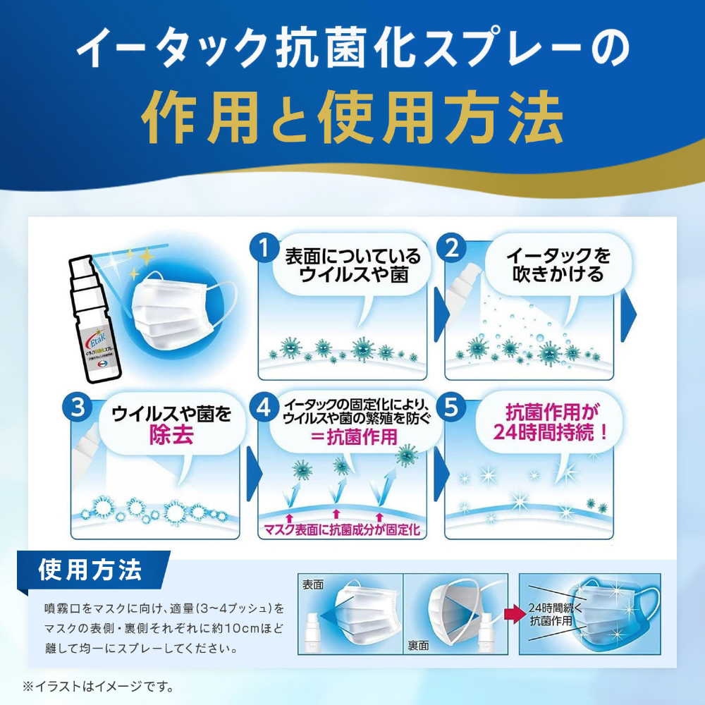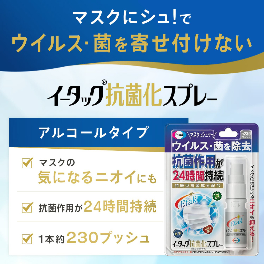 【使用上の注意】 ※必ずお読みください 【使用方法】 イータック抗菌化スプレー使用方法噴霧口をマスクに向け、適量(3〜4プッシュ)をマスクの外側・内側それぞれに約10cmほど離して均一にスプレーしてください。 使い始めは数回空押ししてください。 スプレーしたマスクは軽く振る等してよく乾かしてから使用してください。 色落ち、シミが気になるものは予め目立たないところで試してから使用してください。 本品を逆さ向きに使用しないでください。 マスクを着用したままスプレーしないでください。 【使用上の注意】 アルコールに敏感な方、肌の弱い方は使用しないでください。 スプレーしたマスクはよく乾かしてから使用してください。 皮膚に異常がある場合は使用しないでください。 使用中に気分が悪くなったり、赤み、はれ、かゆみ、刺激(皮膚、鼻、のど)等の異常が出た場合には使用を中止してください。 目に入らないよう注意してください。 万一目に入った場合はこすらずに、水、またはぬるま湯で十分洗い流し、医師に相談してください。 飲用は不可です。 万一口に入った場合は水を飲み吐く等の処置をし、医師に相談してください。 小児が使用する場合は、保護者の指導監督のもとで使用してください。 マスクの使用方法を守り、同じマスクを繰り返し着用しないでください。 用途以外には使用しないでください。 火気の近くでは使用しないでください。 使用する際は十分換気を行ってください。 吸入しないように気をつけてください。 乾燥不十分なマスクを着用しての乗物や機械類の運転操作又は危険な作業等は行わないでください。 建材や家具に付着した場合は、すぐにふき取ってください。 【お問い合わせ先】 「エーザイhhcホットライン」0120−161−454[365日対応] [受付時間] 平日9時〜18時 土日・祝日9時〜17時