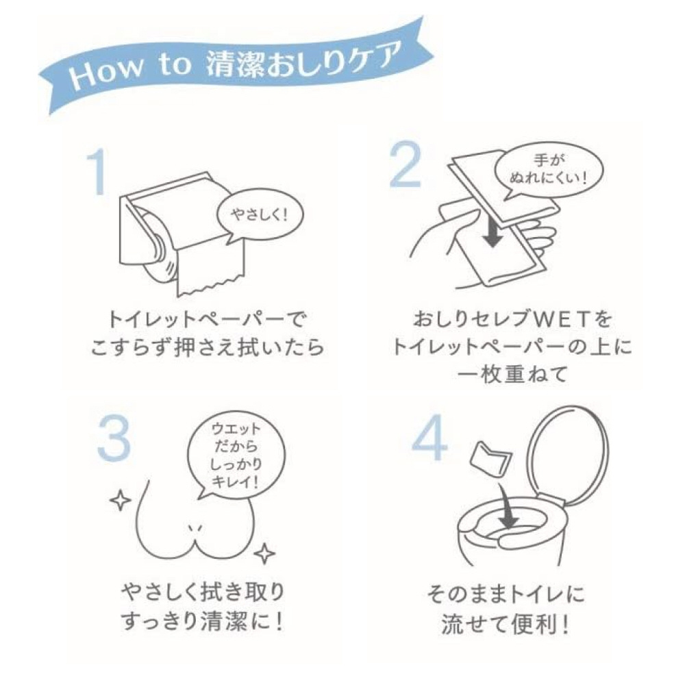 保湿成分配合の水分たっぷりシートが、トイレットペーパーだけでは落とせない汚れをキレイにふき取ります。