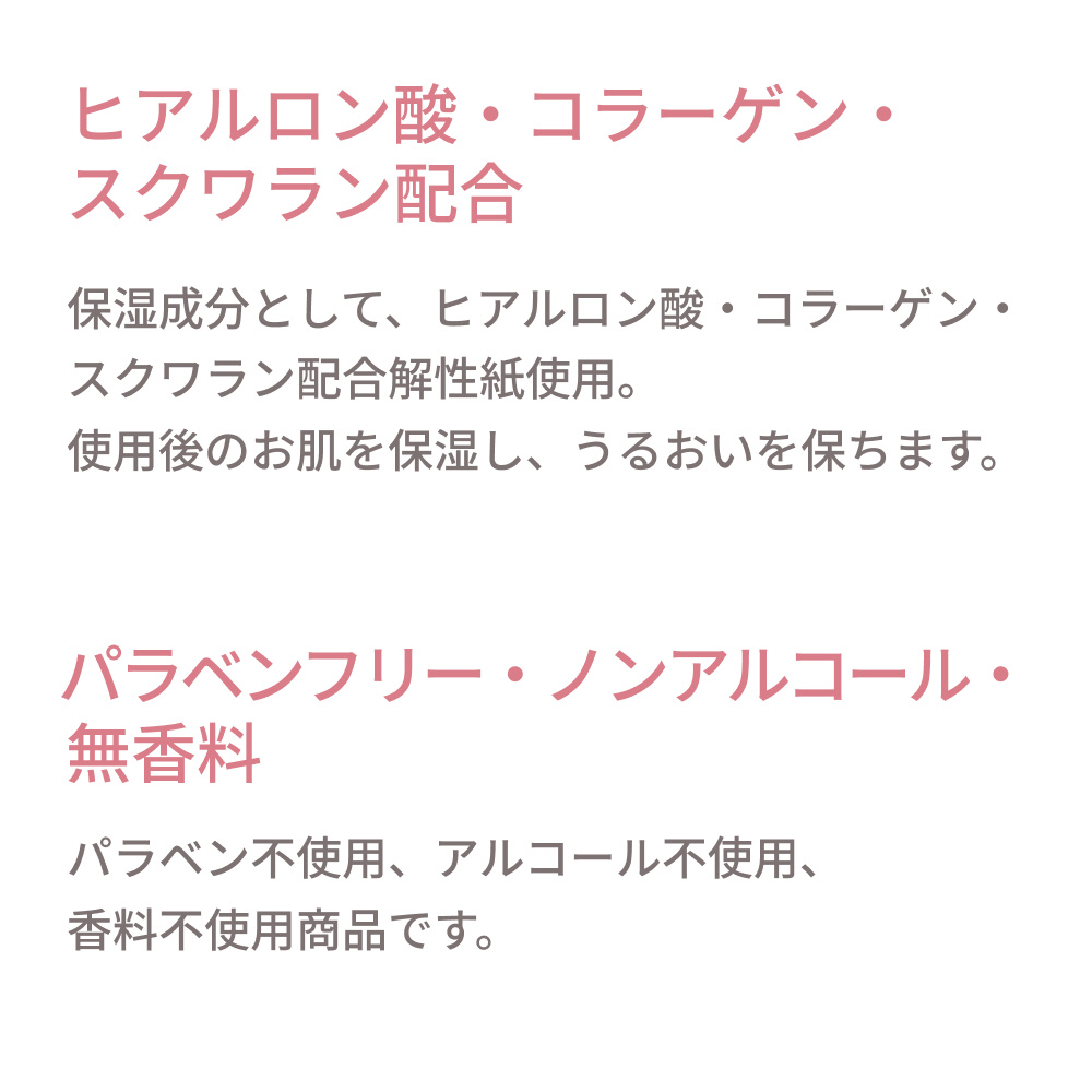 保湿成分として、ヒアルロン酸・コラーゲン・スクワラン配合。使用後のお肌を保湿し、うるおいを保ちます。