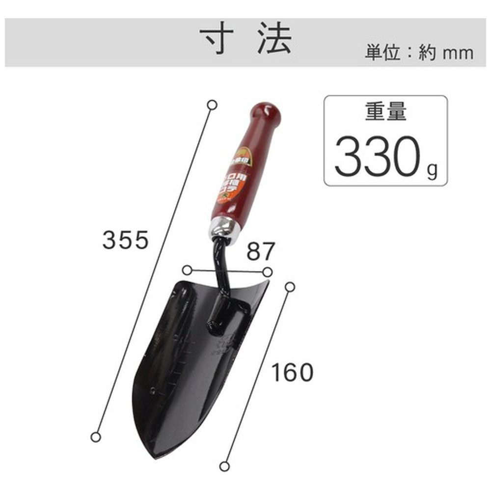 仕様 ■刃先形:移植ゴテ形 ■刃先幅(mm):87 ■刃先長(mm):160 ■全長(mm):355 ■柄部長さ:165mm ■頭部板厚:1.6mm ■【材質/仕上げ】 頭部 スチール  柄部 天然木 ■原産国:日本 ■質量:330G