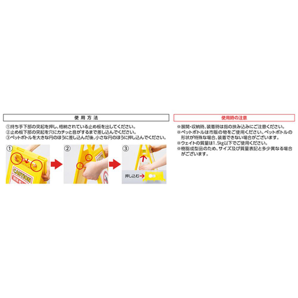 仕様 ■内容:関係者以外 立入禁止 ■本体寸法(mm):600×280 ■両面表示 ■【材質/仕上げ】 本体(ABS樹脂) 表示部(ユポステッカー) ■【セット内容/付属品】・本体+両面同内容ステッカー2枚付 ■注意・ペットボトルの形状が特殊な場合装着できない場合があります。・ウェイトの重量は1.5kg以下でご利用下さい。・ペットボトルは付属しておりません。 ■原産国:日本 ■質量:1.1KG