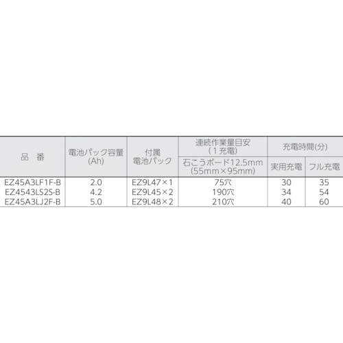 仕様 ■切込深度(mm)石こうボード:30 ■切込深度(mm)木工:15 ■ストローク数(min[[の-1乗]]):6600 ■色:黒 ■電池容量(Ah):3.0 ■付属電池パック:EZ9L53×2 ■充電時間(分)(実用充電、フル充電):40、55 ■作業量(1パック)石膏ボード12.5mm 55mm×95mm:160穴 ■オービタル固定式 ■国際規格(IP5X)試験合格 ■充電時間:40分(実用充電)、55分(フル充電) ■【セット内容/付属品】・付属品:ケース(EZ9662)・急速充電器(リチウムイオン専用)EZ0L81・電池パックEZ9L53(2個)・六角レンチ・ベースカバー・ダストケース・石こう専用ブレードEZ9SXB10(2枚)(EZ45A3シリーズ)・石こう用ブレードEZ95XB10(1枚)(EZ4543シリーズ)・木工用ブレードEZ95XW10(1枚)(EZ4543シリーズ) ■原産国:日本 ■質量:1.8KG