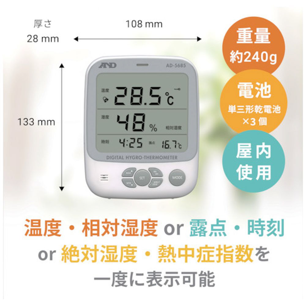 仕様 ■測定温度範囲(℃):0〜50 ■温度最小表示(℃):0.1 ■測定湿度範囲(%RH):20〜90 ■湿度最小表示(%RH):1 ■電源:単3乾電池×3本 ■表示項目:温度、露点または熱中症指数、相対湿度または絶対湿度、時刻 ■測定項目:温度、相対湿度 ■電源:モニター単3乾電池×3本(付属) ■幅×奥行×高さ:108×28×133mm ■温度最小表示:0.1℃ ■湿度最小表示:1%RH ■温度測定精度:±1℃(10.0℃〜39.9℃)、±2℃(0℃〜9.9℃、40.0℃〜50.0℃) ■湿度測定精度:±5%RH(30%RH〜69%RH)、±10%RH(20%RH〜29%RH、70%RH〜90%RH)、25℃時 ■電源 /電池寿命:単3形乾電池3本(モニタ用)/約1年(アルカリ電池使用、アラーム動作なしの場合) ■外形寸法 /本体質量:108(W)×133(H)×28(D)mm/約240g (電池含む) ■【材質/仕上げ】 ABS樹脂 ■【セット内容/付属品】・取扱説明書、電池(モニタ用) ■注意・本製品は、熱中症発症を完全に防止できる製品ではありません。・熱中症の発症は、温度、湿度、輻射熱などの温熱環境、性別、年齢、既往歴や健康状態などの個人差、運動、労働、日常生活活動などの状況、など様々な要因が作用します。・ご使用にあたっては、本製品の特性をよくご理解の上、あくまで目安としてお使いください。・本製品をご使用中、気分が悪くなった場合には、本製品の表示に係わらず、涼しい場所に移動したり、医師の診察を受けるなどの処置をしてください。・本製品は医療目的に開発・製造されたものではありません。・あくまで一般的な日常生活における季節性インフルエンザ予防の目安とするものです。・季節性インフルエンザ予防温湿度計は新型インフルエンザの流行には対応しておりません。・また、季節性インフルエンザ感染を予防できる製品ではありません。 ■原産国:中国 ■質量:240G