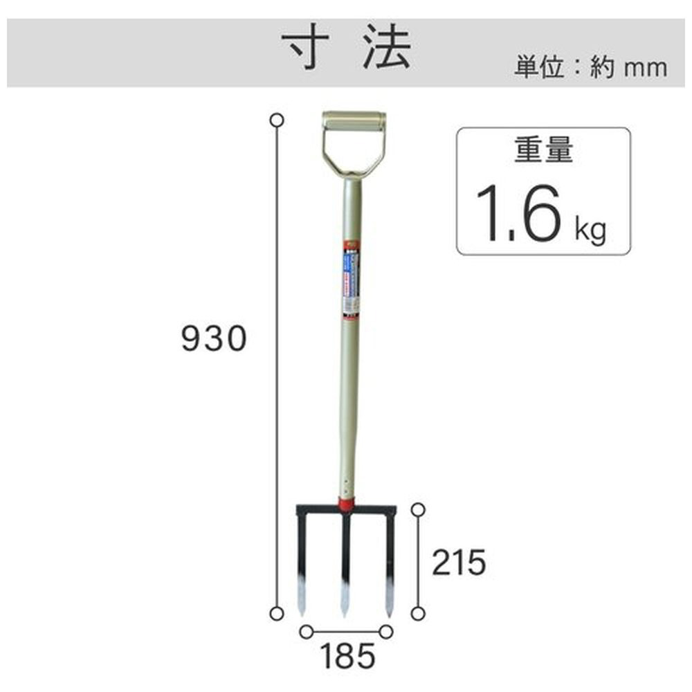 仕様 ■全長(mm):930 ■先幅(mm):185 ■爪数(本):3 ■高さ(mm):215 ■【材質/仕上げ】 頭部:スチール(炭素鋼) 柄部:スチールパイプ ■原産国:日本 ■質量:1.6KG