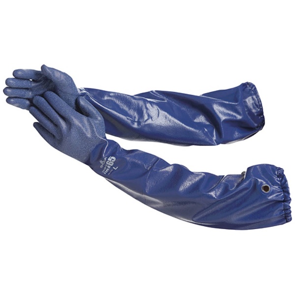指先から肩口まで継ぎ目のない一体型ニトリル製ロング手袋です。