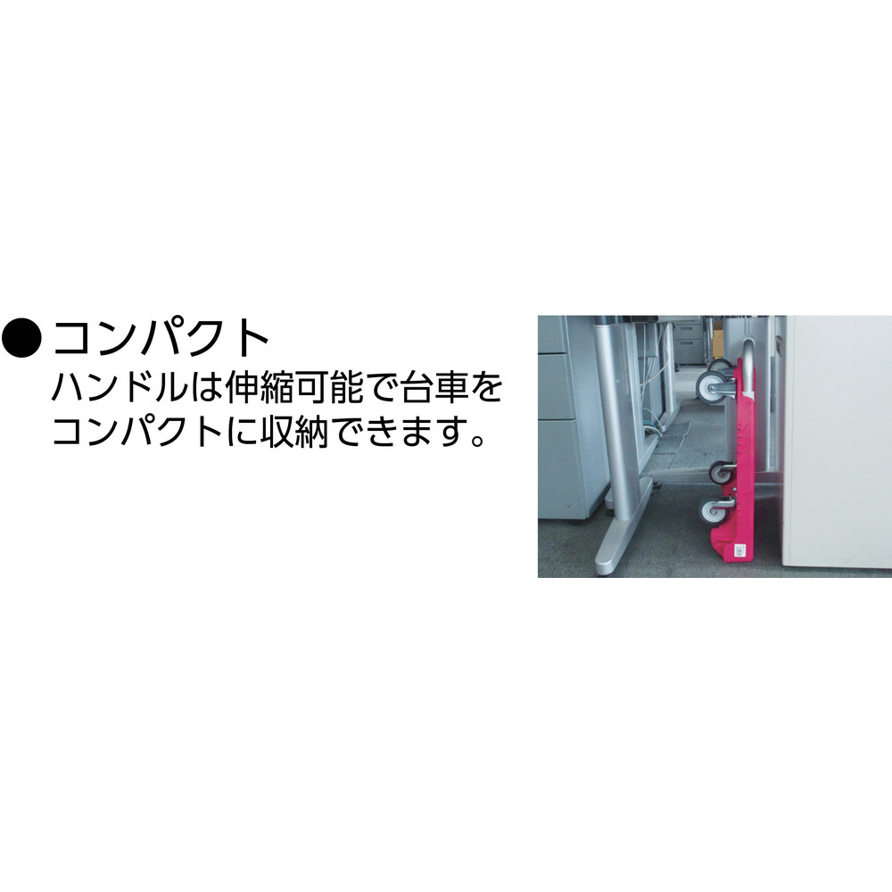 仕様 ■均等荷重(kg):100 ■色:ブラック ■長さ(mm):465 ■幅(mm):390 ■高さ(mm):133 ■ハンドル高さ(mm):790 ■キャスター径(mm):75 ■騒音値(dB):- ■完成品 ■伸縮式折りたたみハンドルタイプ ■自在キャスター、固定キャスター各2個(固定キャスター:ハンドル側取付) ■ストッパー付 ■騒音値:45dB ■伸縮式折りたたみハンドルタイプ ■樹脂ストッパー付 ■【材質/仕上げ】 荷台:再生ポリプロピレン(PP)再生材100% ハンドル:アルミ ハンドル表面処理:アルマイト加工 キャスター金具:スチール 車輪:エラストマー樹脂 ストッパー:ポリカーボネート ■原産国:日本 ■質量:3.12KG