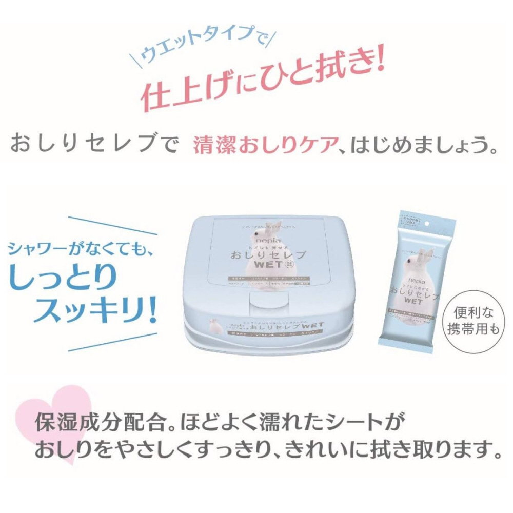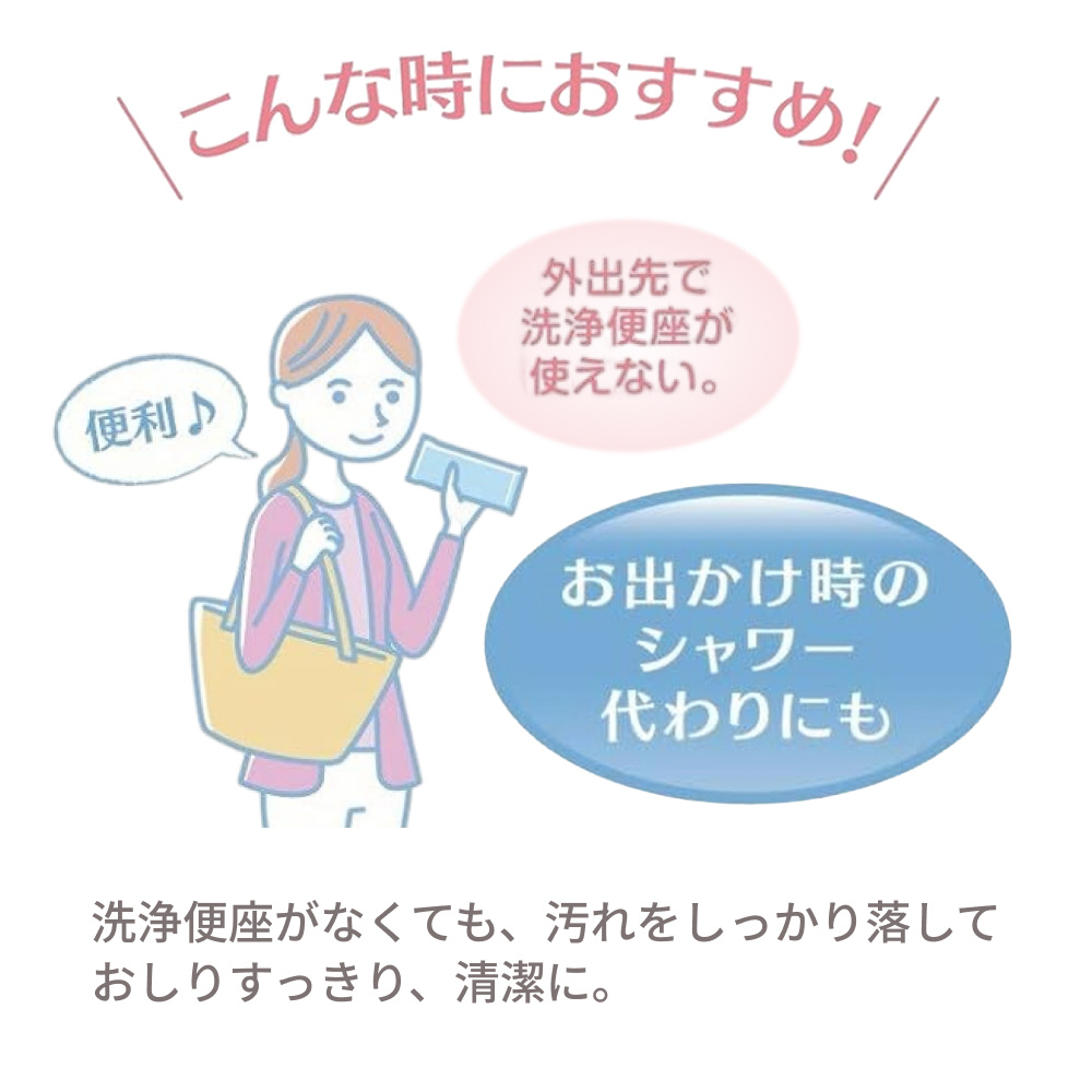 水分たっぷりシートで、シャワー付きトイレがなくても、おしりすっきり。便利な携帯タイプ。