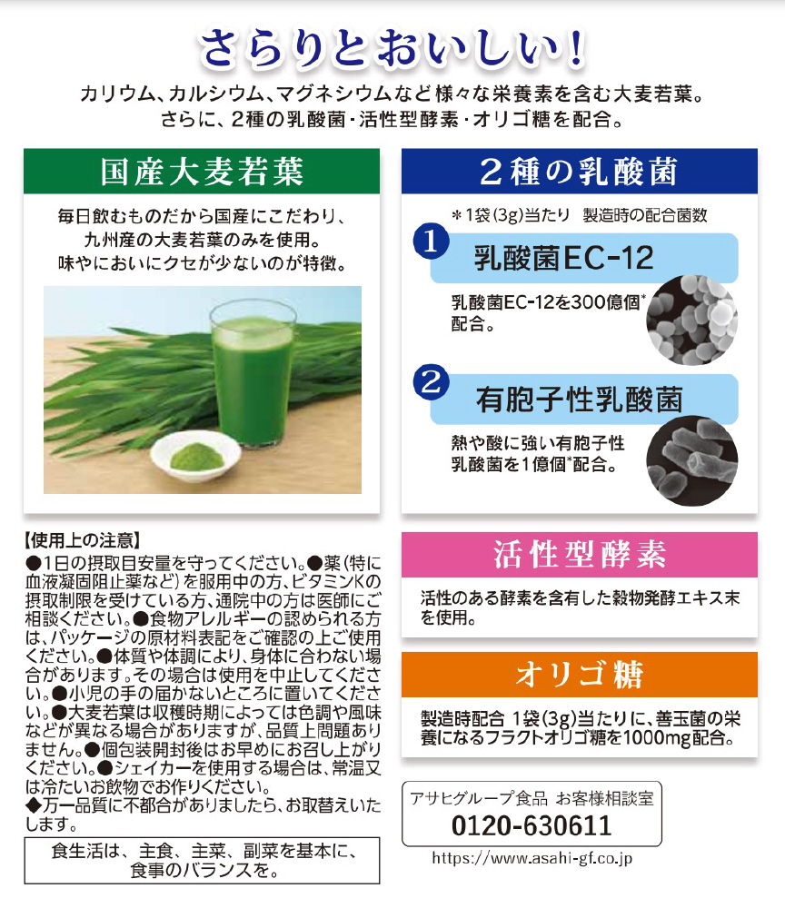 原材料 大麦若葉粉末、チコリ由来オリゴ糖、穀物発酵エキス末(小麦を含む)、有胞子性乳酸菌末、桑葉末、酵母エキス、殺菌乳酸菌粉末(乳成分を含む)