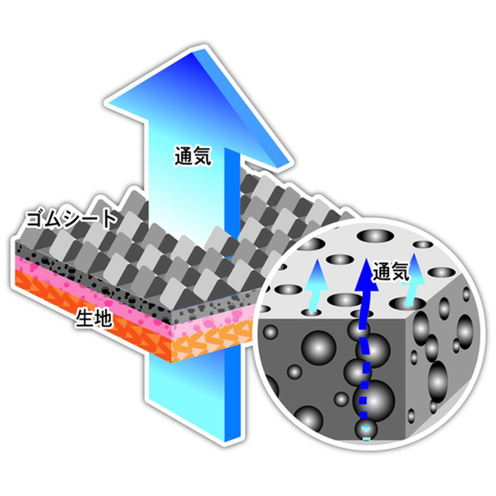 ■独自の通気ゴム素材「ポーラス加工」により、手のひらでも通気するのでムレを軽減します。