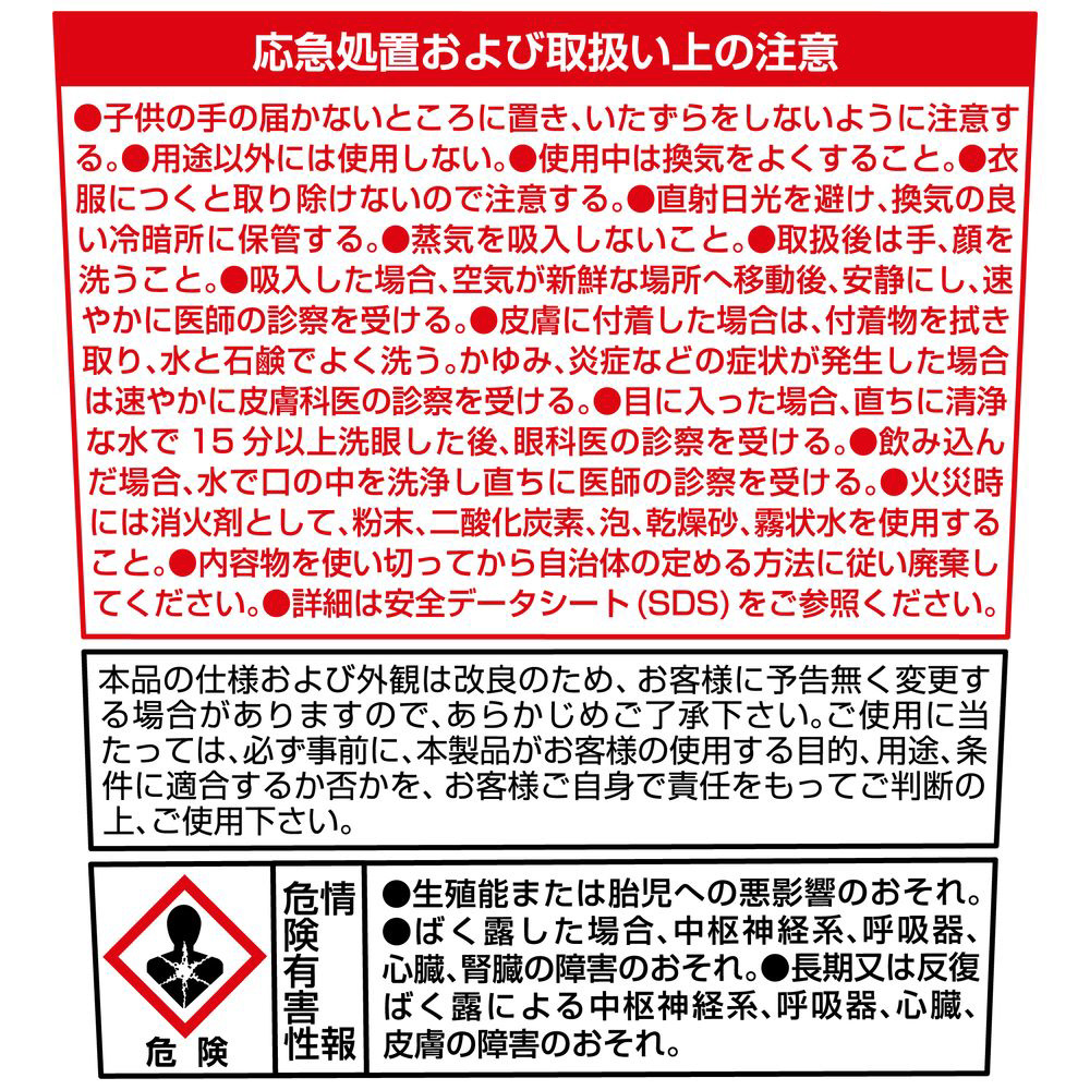 仕様 ■屋内部下地(石膏ボード、コンクリート、木部、プラスターなど)のひび割れに。 ■色:白 ■容量(ml):900 ■【材質/仕上げ】 硬化時間(23℃):24時間 アクリル樹脂系エマルジョン形充てん材 ■原産国:JP ■質量:日本538