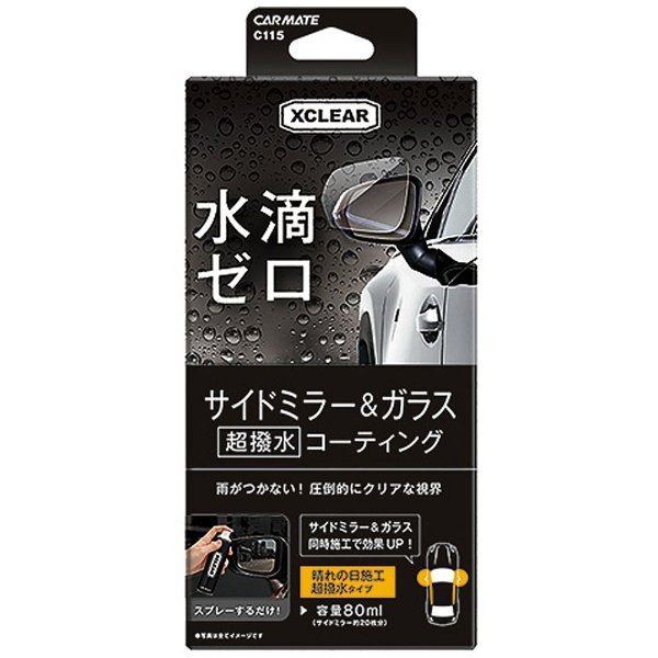 停車中0km/hでも雨がつかない超撥水被膜が、サイドミラーの視界を確保します。スプレーするだけで台風・霧雨でもクリアな視界。サイドミラー・サイドガラスに使える。内容量80ml。