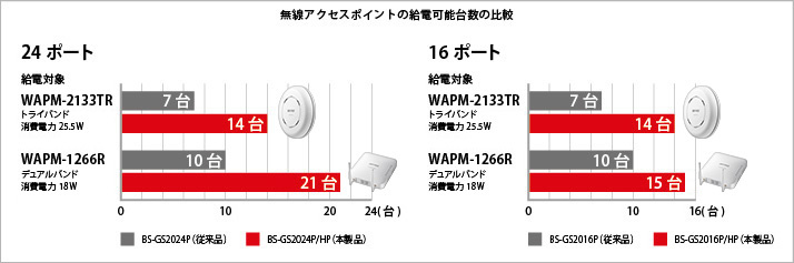 従来モデル(180W給電)※に比べ給電能力を2倍以上に増強しました。高性能な無線アクセスポイントを多台数給電するのに最適なPoEスマートスイッチです。