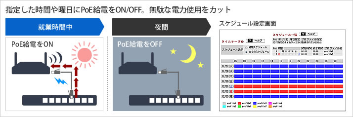指定した時間や曜日にPoE給電をON/OFFできるPoEプロファイラー機能を搭載。例えば、無線LANアクセスポイントが使われることの少ない夜間や休日にPoE給電を止めることで手間なく無駄な電力使用を省くことができます。