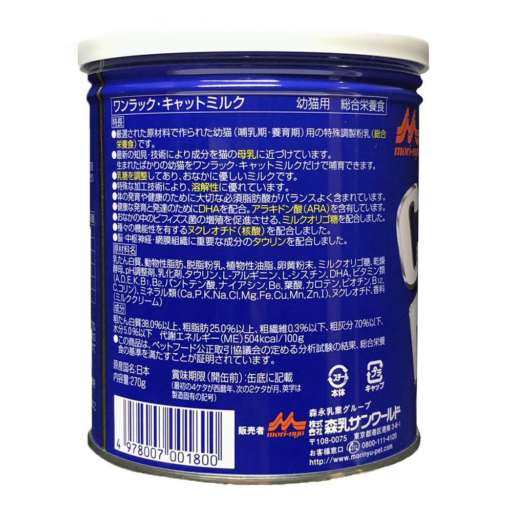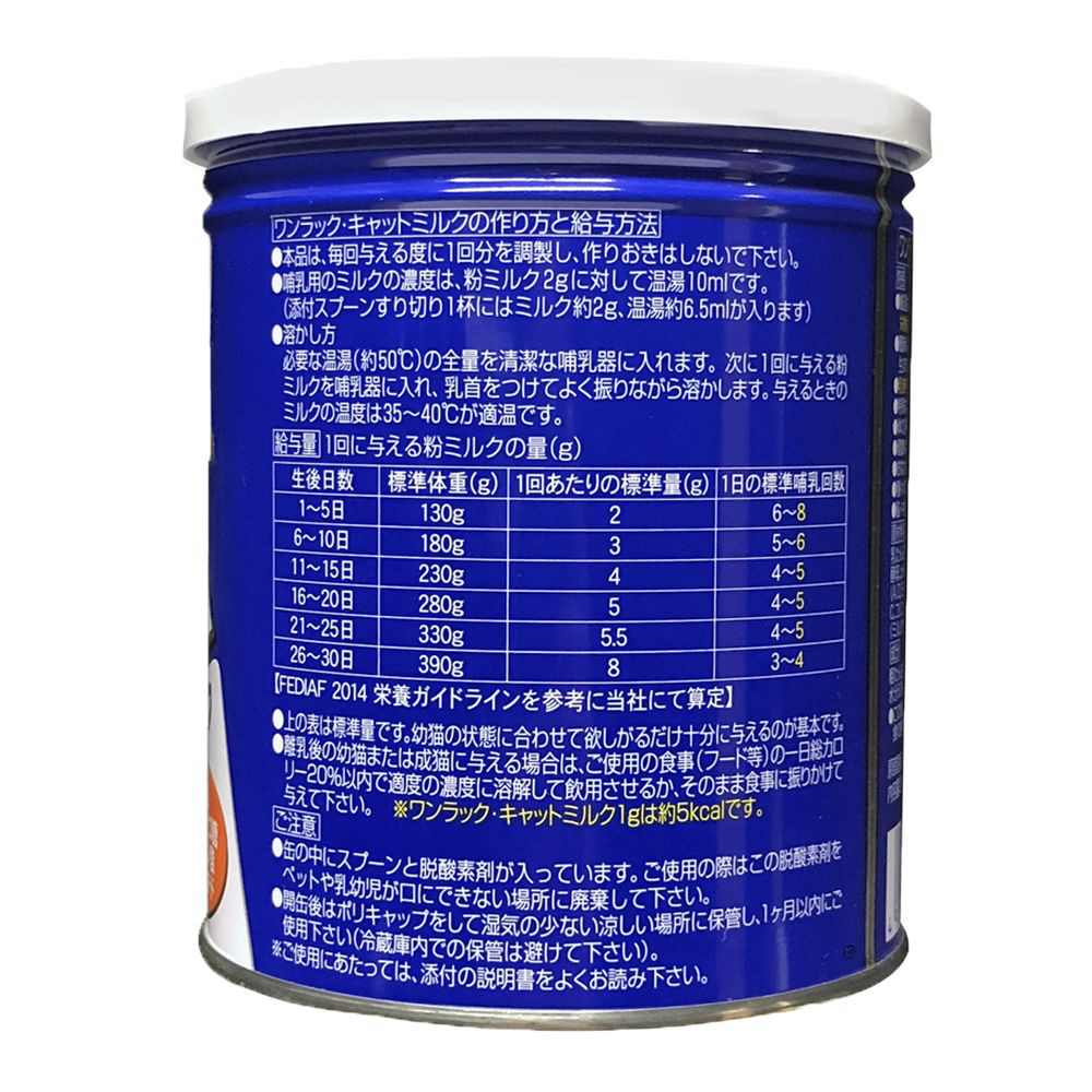 猫の健康な成長をサポートするミルク●吟味された食品原材料のみで作られた幼猫(哺乳期・養育期の子猫)用の特殊調製粉乳(総合栄養食)です。成猫にもご利用いただけます。●成分を猫の母乳に近づけています。産まれたばかりの幼猫をワンラック・キャットミルクだけで哺育できます。●乳糖を調整してあり、おなかに優しいミルクです。●特殊加工技術により、溶解性に優れています。●体の発育や健康のために大切な必須脂肪酸がバランスよく含まれています。特にドコサヘキサエン酸(DHA)を強化し、アラキドン酸(ARA)を含有しています。●幼猫のおなかの中のビフィズス菌を増やすミルクオリゴ糖を配合しました。●種々の生理機能を有するヌクレオチド(核酸)を強化しました。●猫に必須のアミノ酸タウリンを強化しました。
