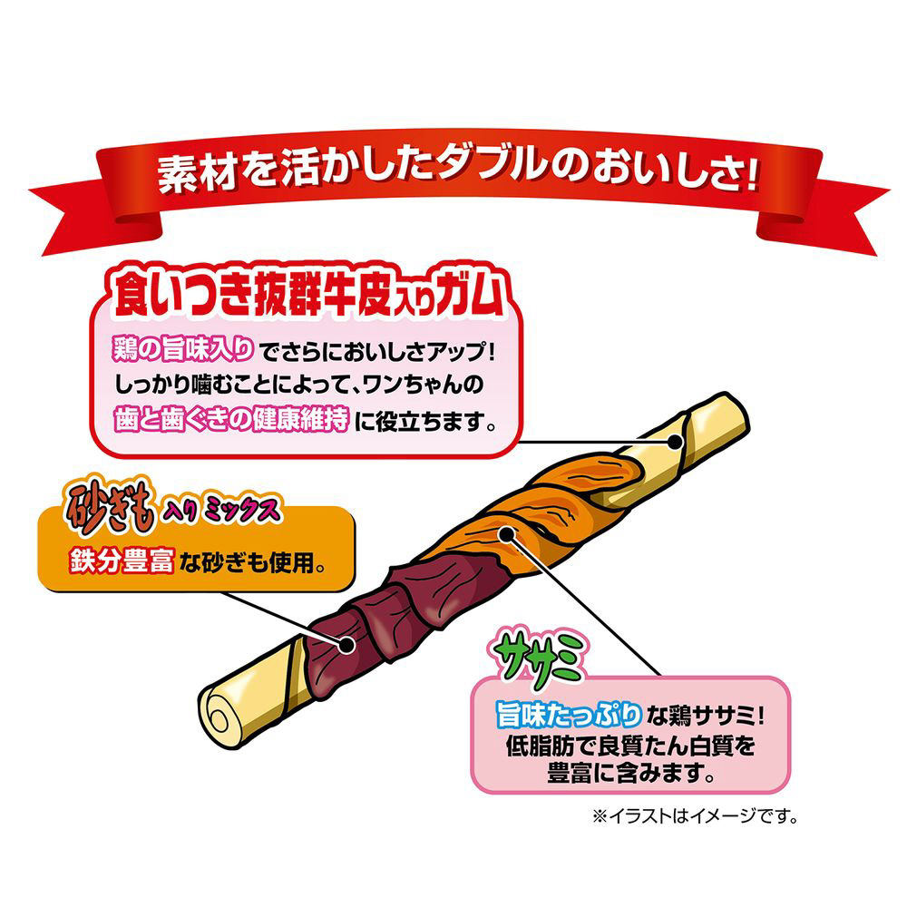 ■鶏ササミと砂ぎもの2つの味わいが楽しめる!最後まで美味しく味わえるダブル巻きガム!