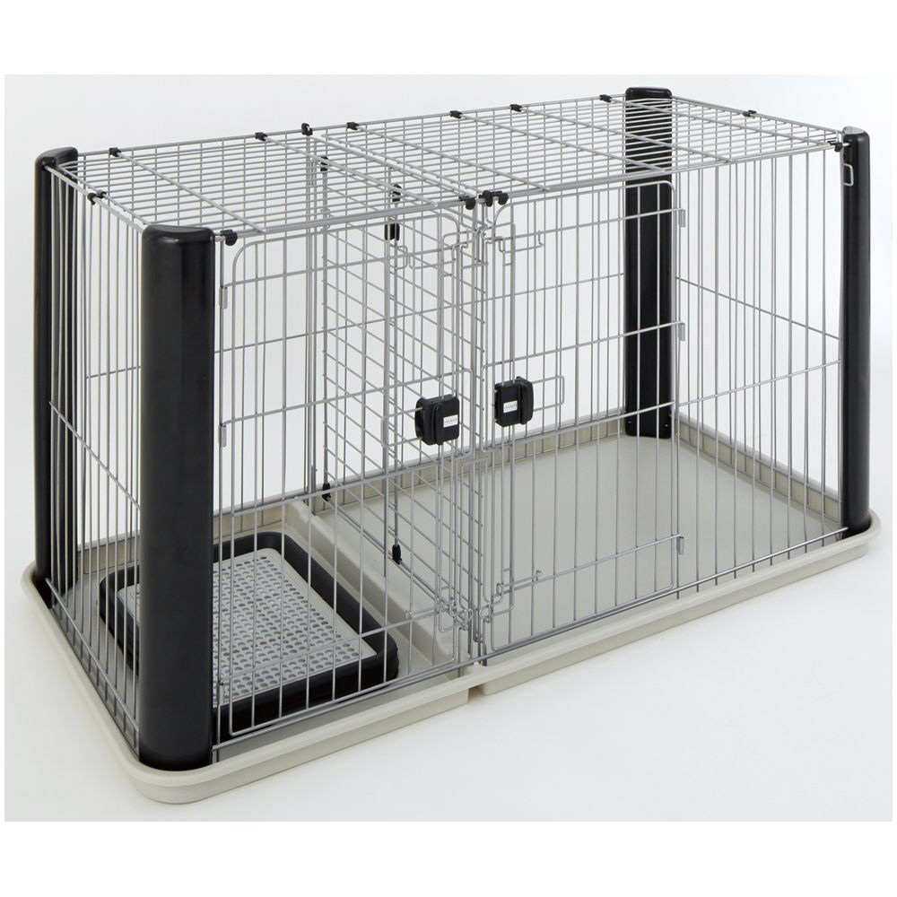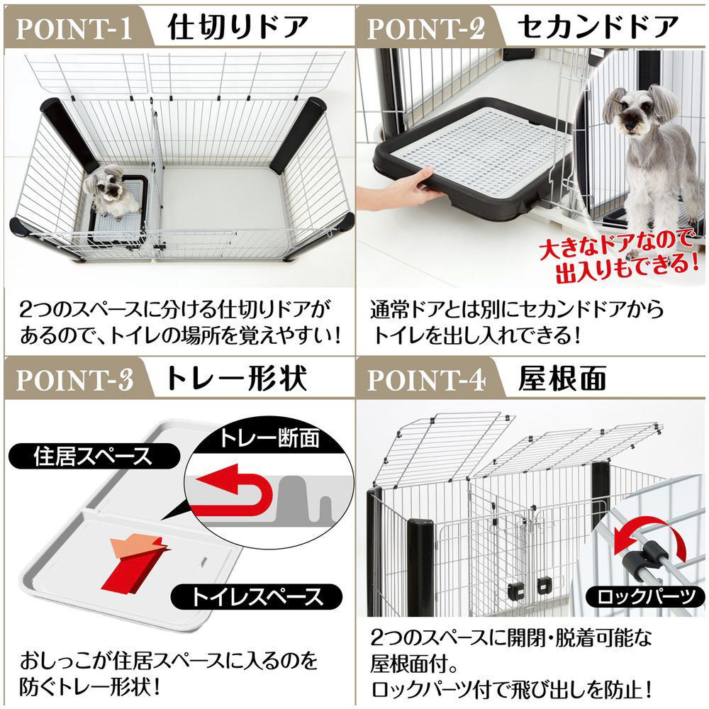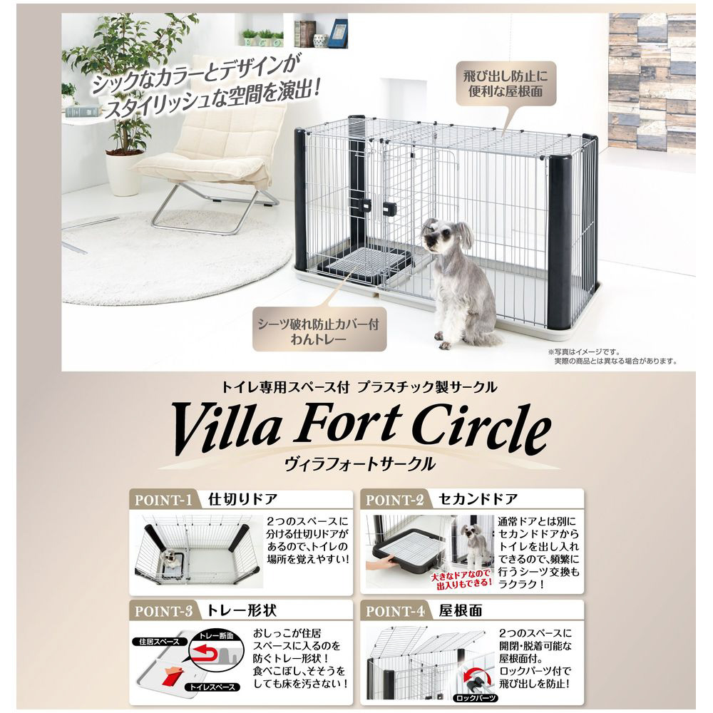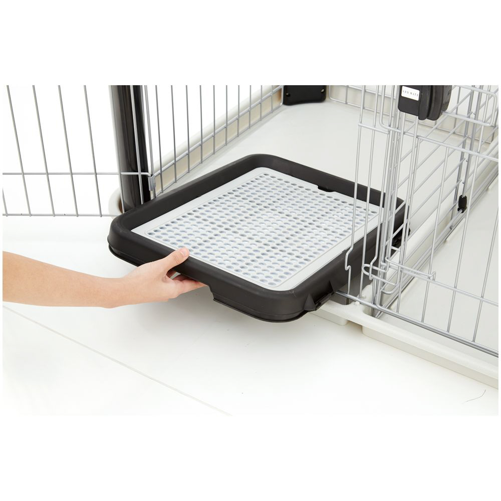 シックなカラーとデザインがスタイリッシュな空間を演出します。住居とトイレスペースにわかれているので、トイレのしつけをすることが出来ます。飛び出し防止用の2つのスペースに開閉・着脱可能な屋根面付き。