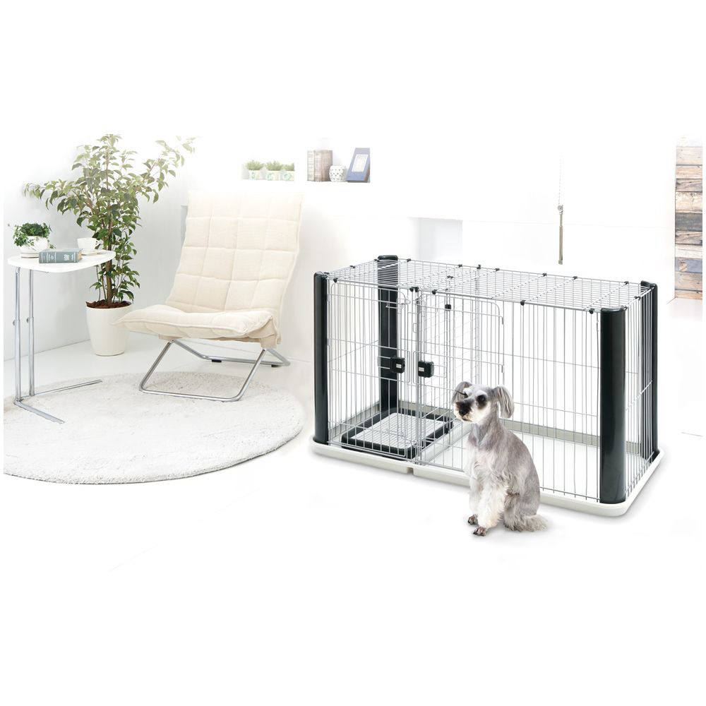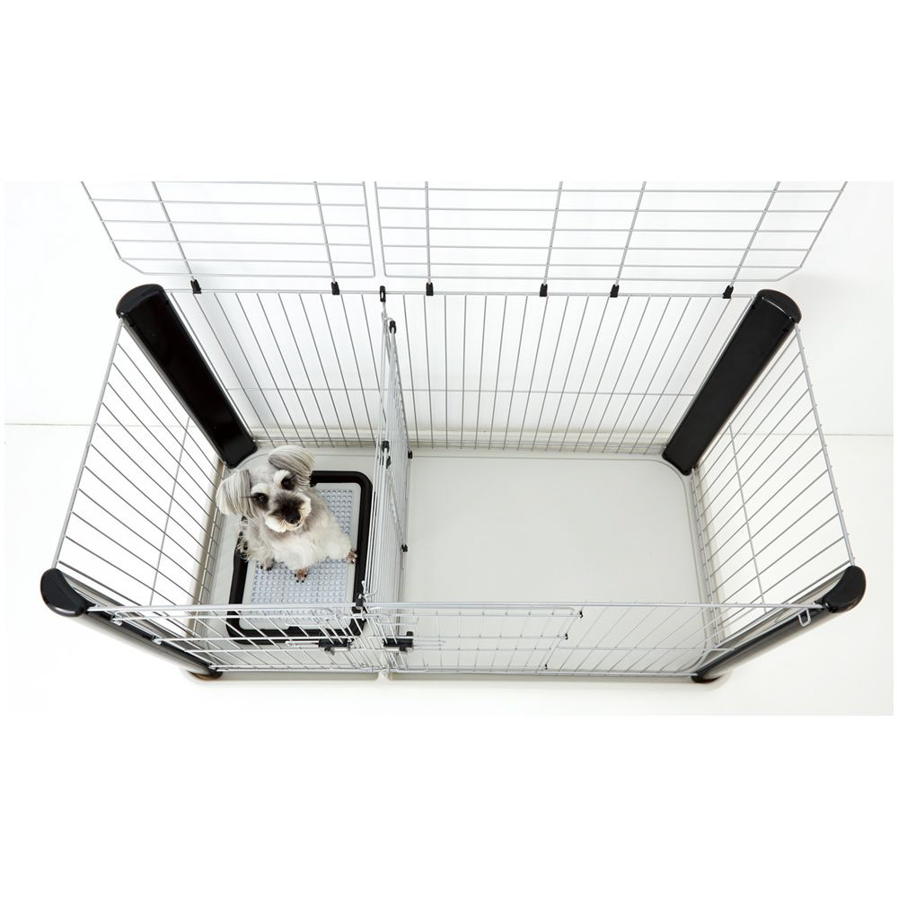 柱が樹脂製のおしゃれなサークル。トイレスペースと住居スペースが別れているのでトイレの場所を覚えさせるしつけにもピッタリ!