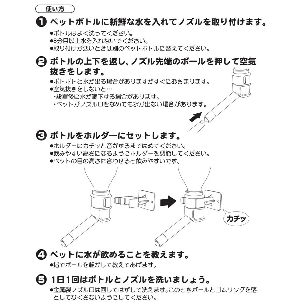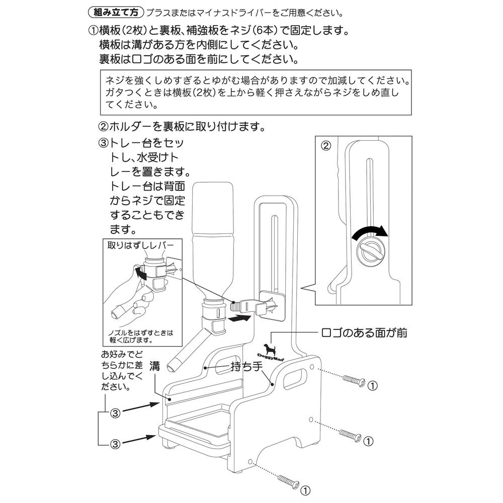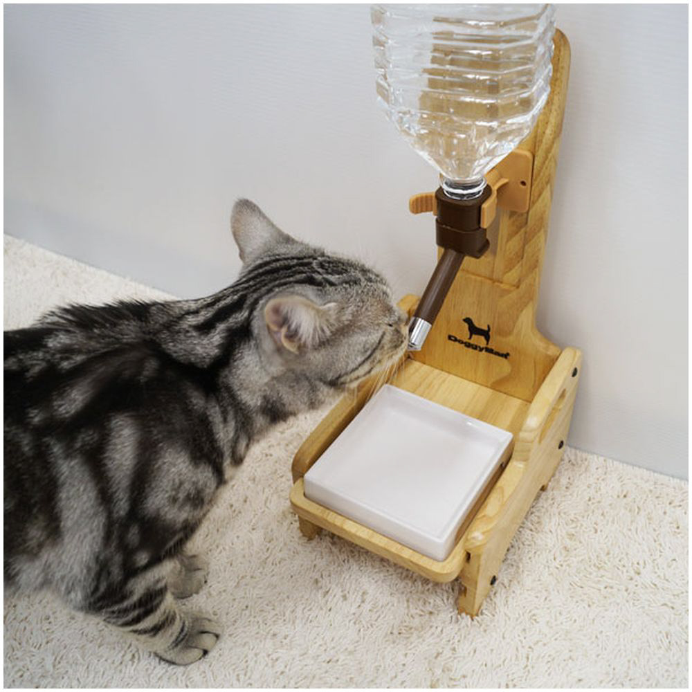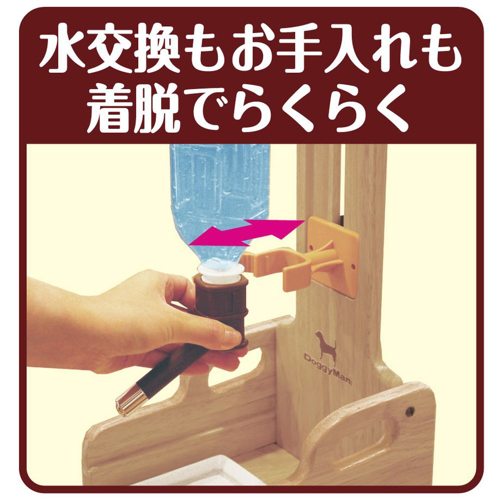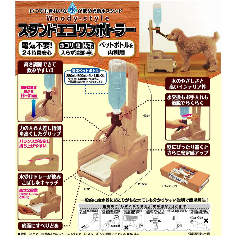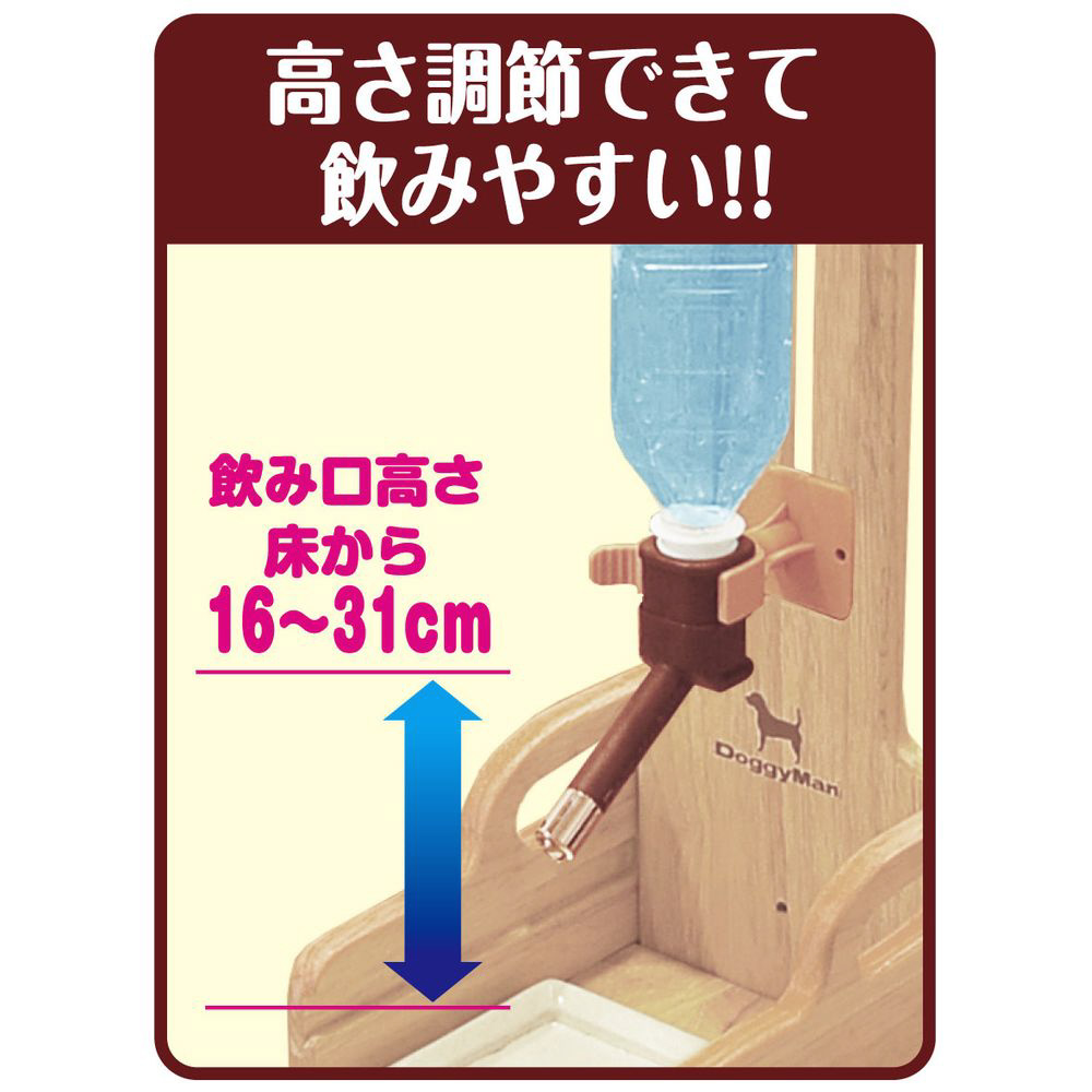 ・いらなくなったペットボトルを給水タンクに使用するドリンクノズルが付いた、木製スタンド。・ケージやサークルが無くても、壁に穴を開けなくてもペットボトルのドリンクノズルを使用できる。・飲み口の高さを床から16?31cmの範囲で自由にセットできる。・飲みこぼしなどを受けるトレーとトレー台も付属。・組み立て簡単、プラス叉はマイナスドライバーをご用意ください。・ノズル部とホルダー部の着脱はパチンとワンタッチ。水の入れ替えなど、お手入れも簡単。・一部、飲み口が合わないペットボトルもありますが、350ccから2Lまでのペットボトルに対応。