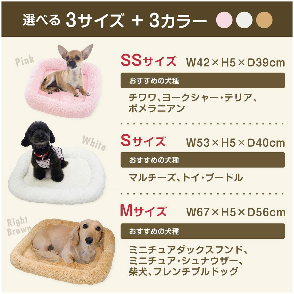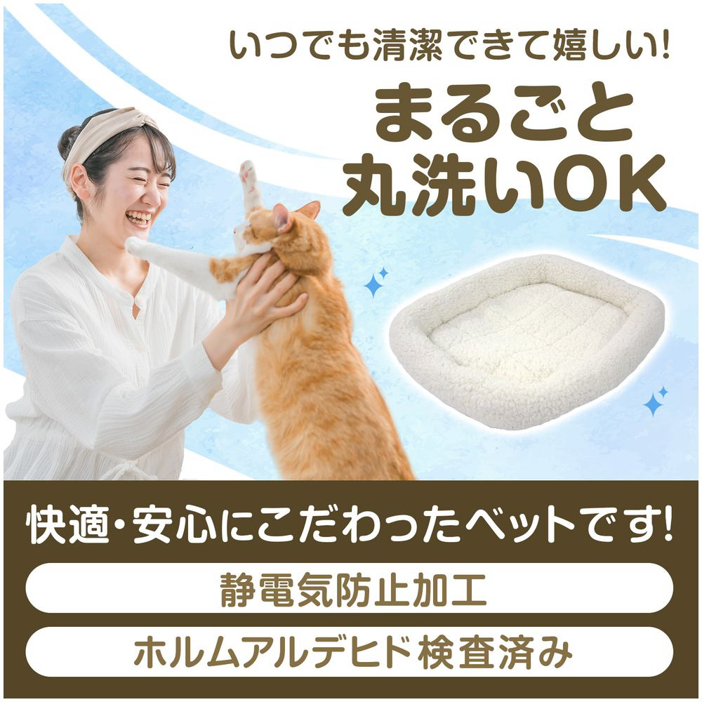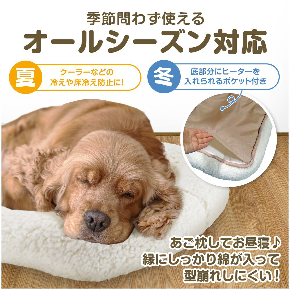 ふっくら弾力のある肌触りのいいベッドですシンプルで飽きのこないデザインで、季節を問わずオールシーズンお使いいただけます。(夏場には、クーラーなどの冷え防止にも)。ふわふわな生地で肌触り抜群!縁は少し高くなっているのであご置きとしても。裏には、滑り止めとポケットが付いています。ポケットには、ヒーターなどが入れられるのでとっても便利です。本体サイズ:幅420×奥行390×高さ50mm