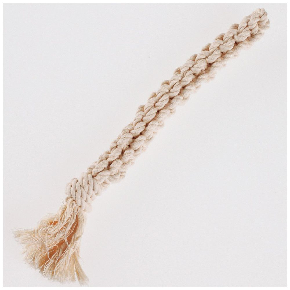 しっかり噛める、コットン100%。くわえやすい、スティック型のおもちゃ。■コットン糸を編み込んだおもちゃ。「編みあみロープ」で歯が食い込むたびにキュキュキュッと歯みがきするみたいに汚れ取りをお手伝い。■糸をぎゅっと縒ったコットンロープ玩具とちがい、編み目に歯が根元までよく食い込みます。■引っぱりっこ遊びもできます。