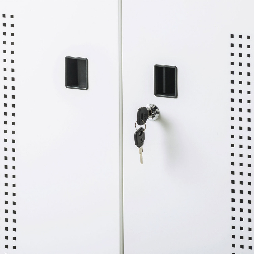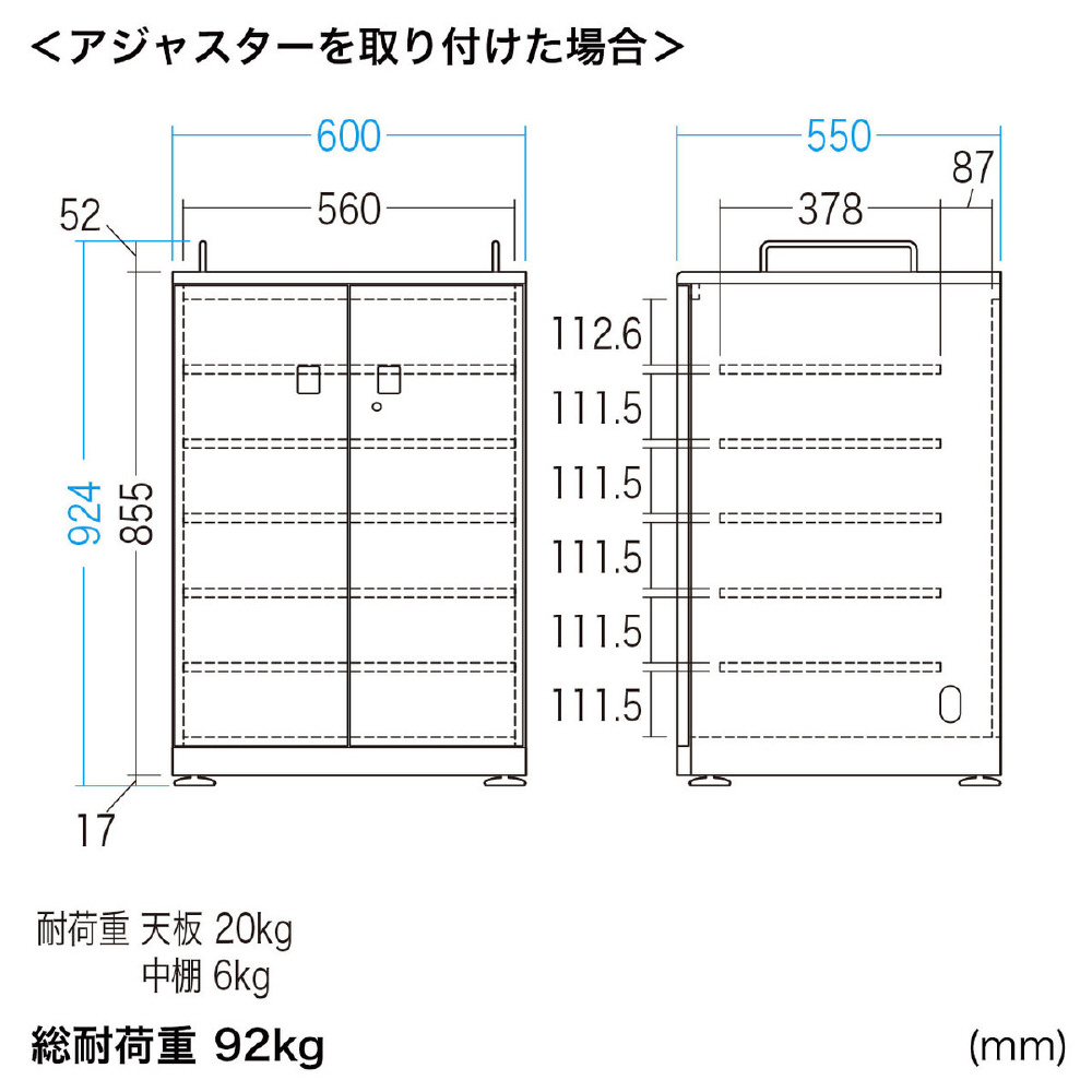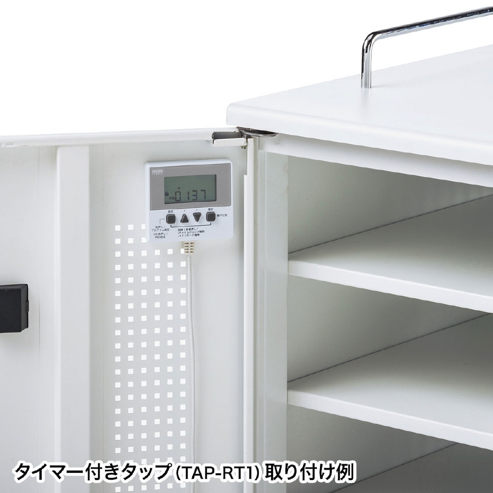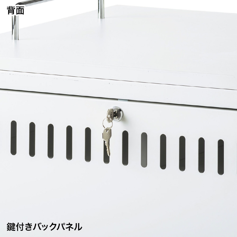 ●ノートパソコンを一括で12台収納できる鍵付き保管庫です。(有効内寸: W273×D378×H111.5mm: 15インチ程度まで対応)〈br〉●背部側面には6個口タップ(TAP-K6シリーズ)が縦に2本入るスペースがあります。〈br〉●背部は鍵付きのバックパネルになっており、配線作業やタップ取り付け時にメンテナンスがしやすくなっています。〈br〉●前面扉は観音扉になっており、取出しがしやすいように170°開きます。〈br〉●後部側面にそれぞれ、ケーブル穴があり、本体を壁に近づけて設置した際でも配線がしやすくできるようになっています。〈br〉●標準でキャスター、アジャスターが付属しており、どちらかの取付けが可能です。〈br〉※全高: キャスター取付け時…993.5mm、アジャスター取付け時…924mm〈br〉※キャスターは長距離の移動を想定したものではありません(直径75mm)〈br〉※棚板の取り外しはできません。〈br〉