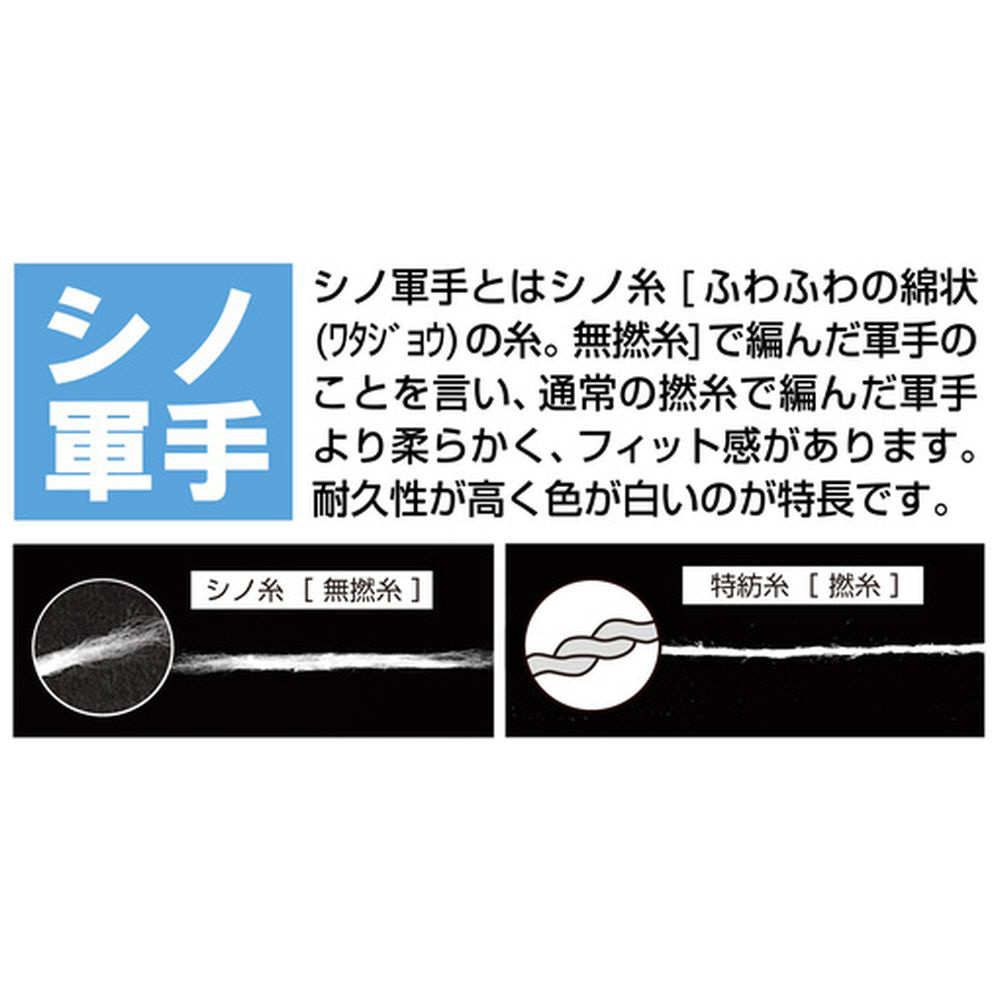 ■軍手はシノ糸を使用しており、厚みがあるため、保護性、フィット感に優れています。