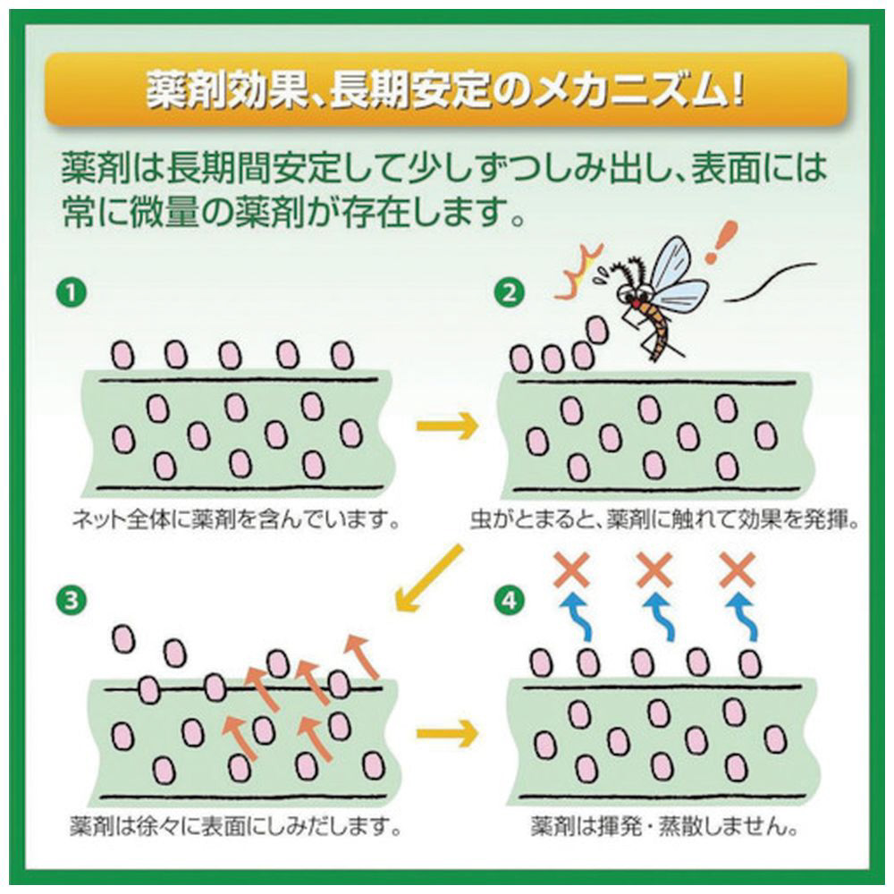 網目と薬剤でダブルの効果。虫を殺さず遠ざける防虫ネット。夜間も網戸に虫がとまり続けず、殺虫しないので窓周りも汚れません。