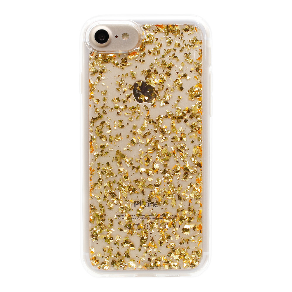 装飾品の一部として重宝されていた純金箔。その高級感ある風合いを同じように表現できる金箔風素材を厳選し、透明度の高いクリアケースに閉じ込め「独創性あふれるケース」に仕上げました。