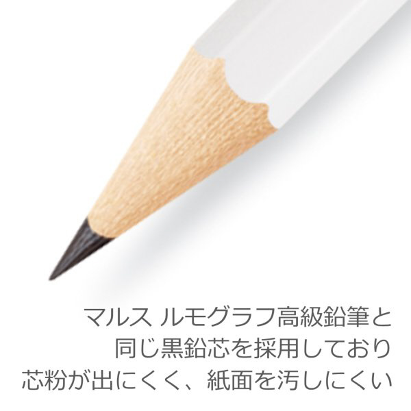 筆記しても芯のヘリが少なく、折れにくく、芯粉が出にくいステッドラーの最高品質鉛筆 マルス ルモグラフと同じ芯を採用しつつ、コストを最小限に抑えました。また、どんな試験会場でも使えるよう、軸にはブランドロゴと硬度(HB)のみをプリントしています。