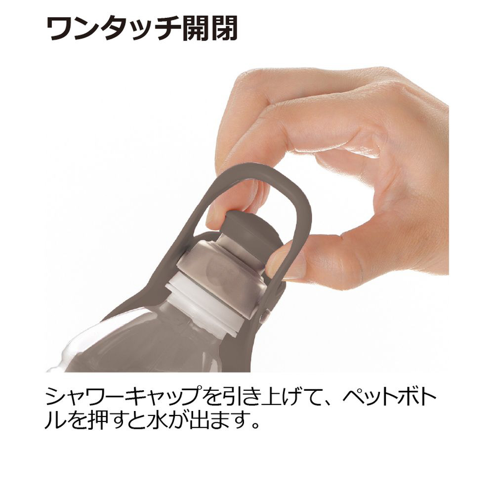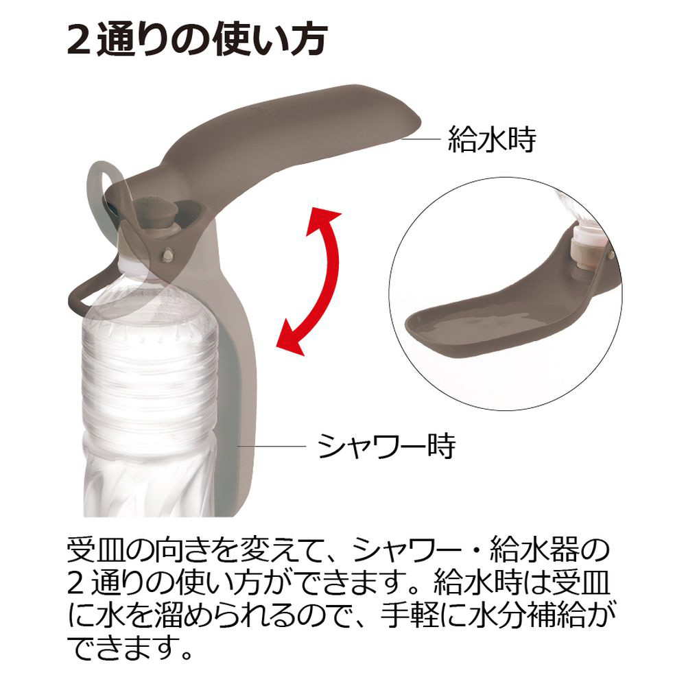 ・シャワーキャップを引き上げて、ペットボトルを押すと水が出ます。\n・受皿の向きを変えて、シャワー・給水器の2通りの使い方ができます。給水時は受皿に水を溜められるので、手軽に水分補給ができます。\n・カラビナ付きなのでリード、バッグ、ベルト通しなどに引っ掛けて携帯できます。