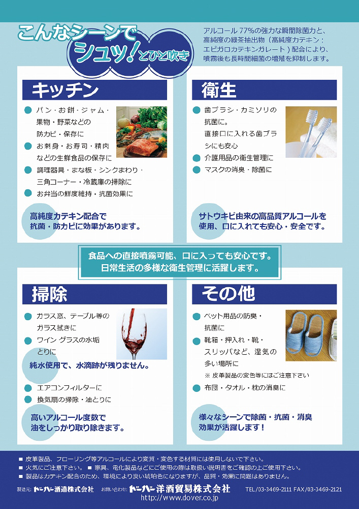 ●高純度のカテキンを配合していますので琥珀色を帯びることがありますが、品質に問題はありません。また噴霧対象物への着色の心配もありません。