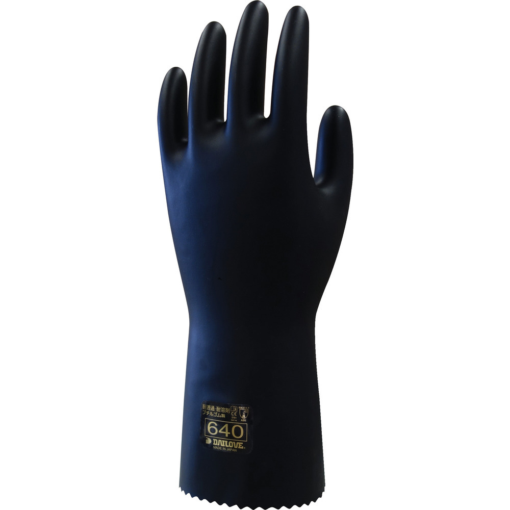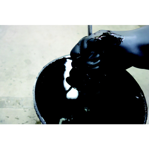 極性溶剤に対して耐透過性・耐溶剤性に優れます。アセトン・メタノール・DMF(ジメチルホルムアミド)・ニトロベンゼンに対する破過時間は480分以上です。柔らかく作業性の良い手袋です。一体成形により防水性が高く、浸漬作業でも使用可能です。製造工程でパウダー(粉)を一切使用していません。耐候性、耐透過性がよく極性溶剤に耐えるブチルゴム素材を使用しています。