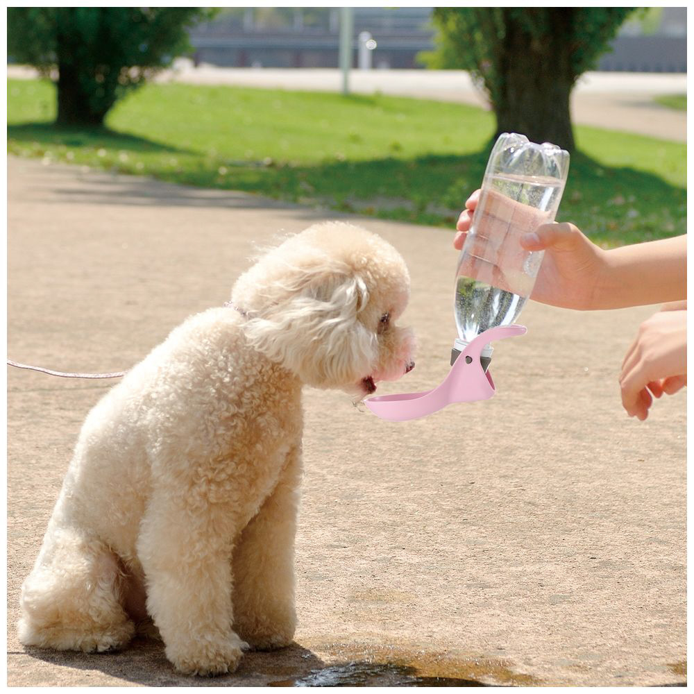 ・シャワーキャップを引き上げて、ペットボトルを押すと水が出ます。\n・受皿の向きを変えて、シャワー・給水器の2通りの使い方ができます。給水時は受皿に水を溜められるので、手軽に水分補給ができます。\n・カラビナ付きなのでリード、バッグ、ベルト通しなどに引っ掛けて携帯できます。