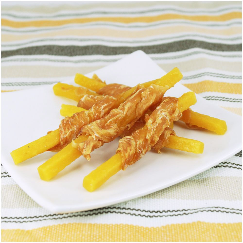 おなかの健康維持に役立つ食物繊維が豊富なさつまいもに鶏ササミを巻きつけた、ヘルシーなスナックです。ササミのカリッとした食感とさつまいものホクホク柔らかい食感が同時に楽しめます。保存料、着色料、発色剤、酸化防止剤を使わず、素材そのもののおいしさをいかしました。