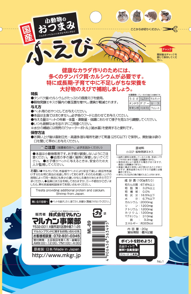 タンパク質・カルシウムがたっぷりのえびを使用。穀物発酵エキスが腸内の善玉菌を増やし、便臭が軽減されます。