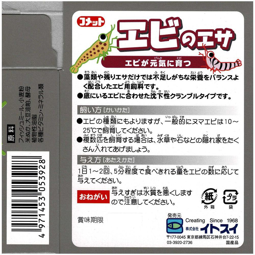 藻類や魚の残りのエサだけでは不足しがちな栄養を、バランス良く配合したエビ用フード。