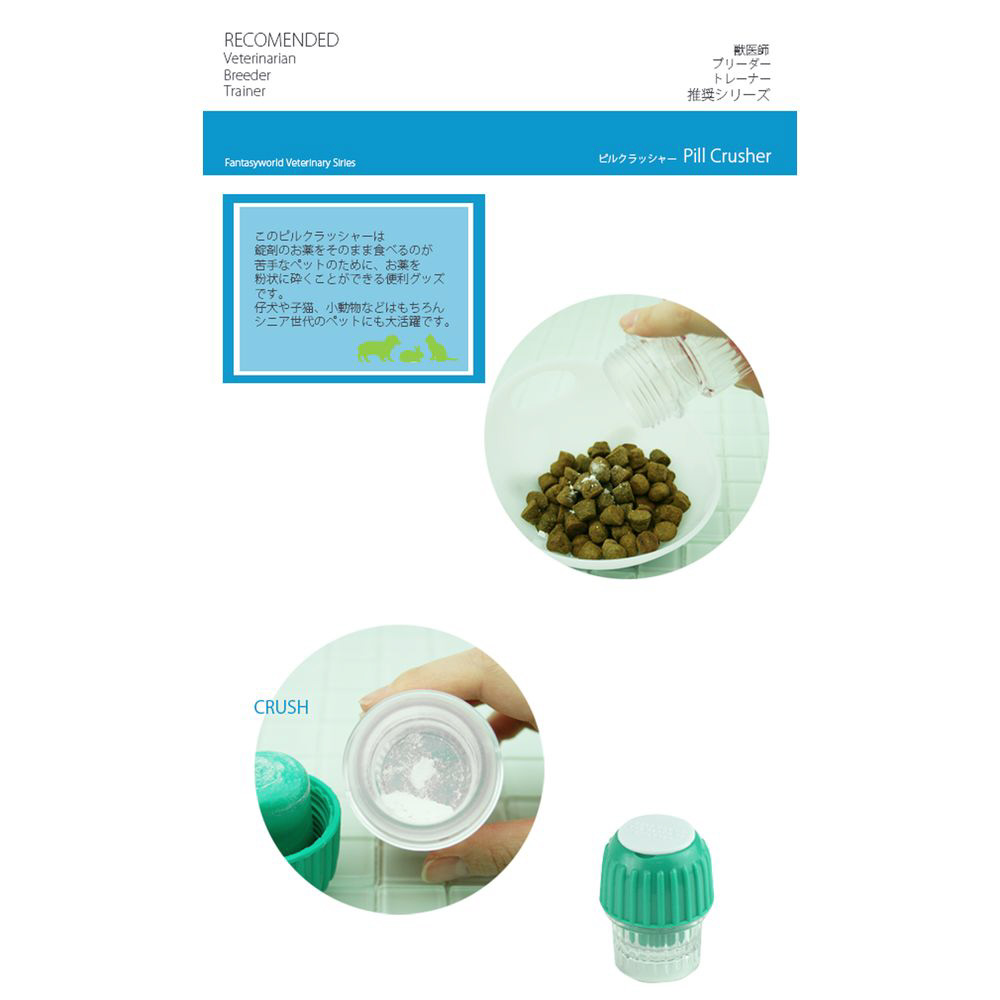 錠剤を簡単にくだいて投薬。薬嫌いなペットにも、好みのエサにトッピングするだけ。人間の薬にも使用可能です。