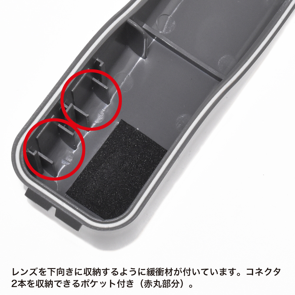 ※ケース内にOsmo Pocketを入れる際には、内部にきちんと収まるよう、カメラの向きにお気をつけください(写真参照)。底面にはレンズ保護のためのクッションがついています。