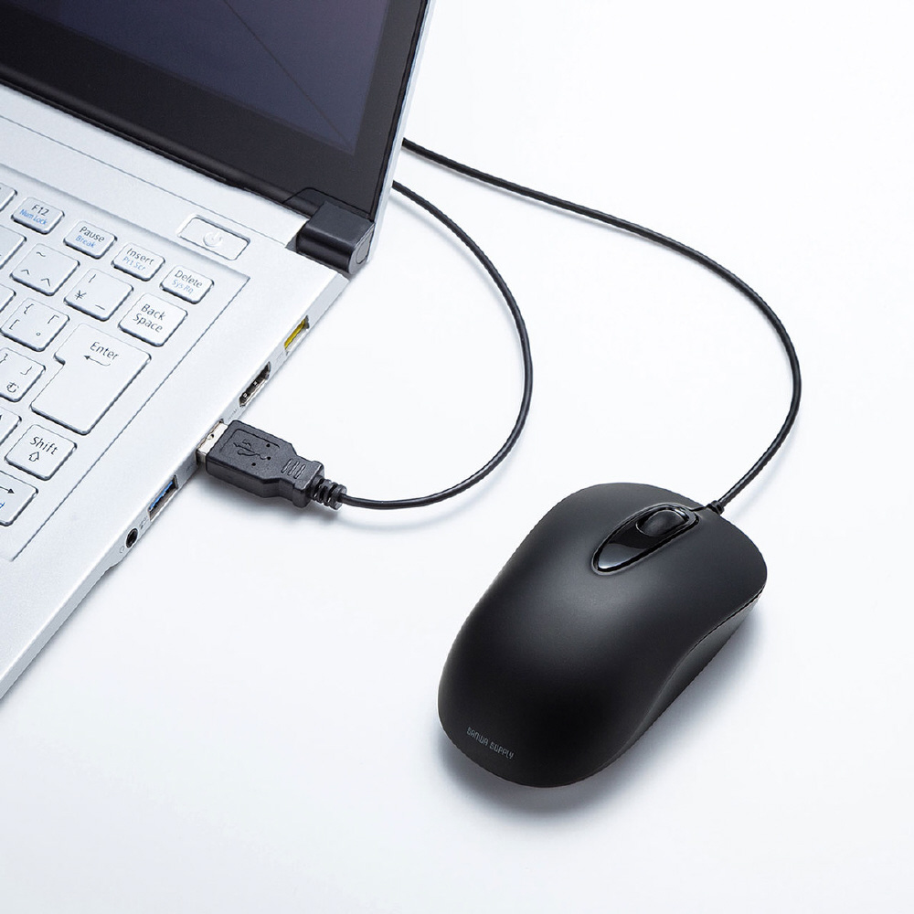 光沢面に強いレーザーセンサー搭載の有線マウス。まとめ買いに最適な紙箱パッケージ。ブラック。