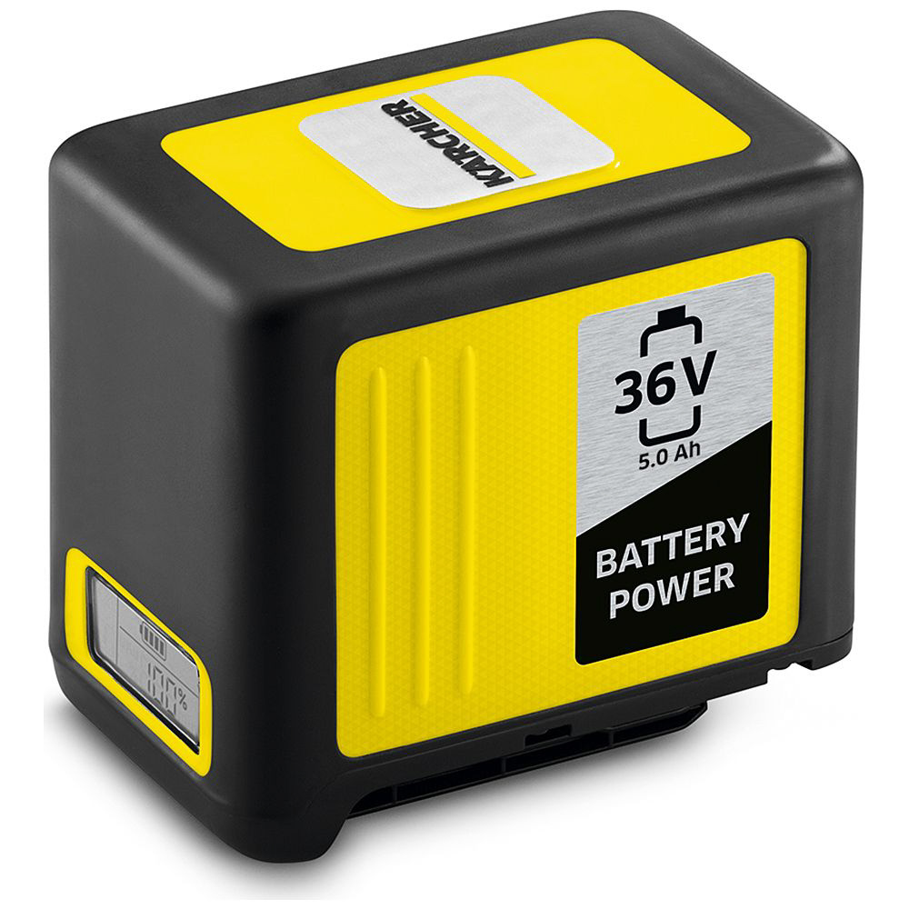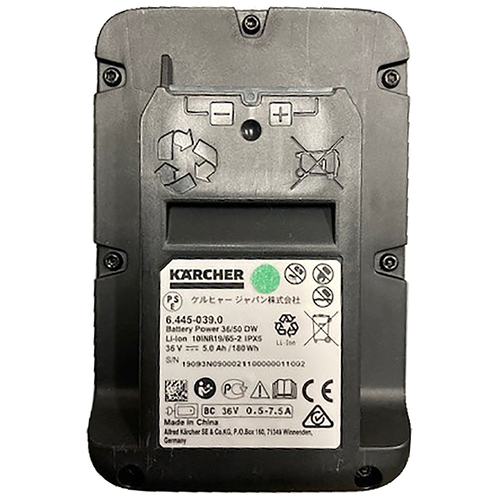 バッテリーの互換性があるので、バッテリーの併用が可能です。ケルヒャーの36V5.0Ahバッテリーパワーはケルヒャー36Vバッテリーパワーを電源とするすべてのケルヒャー機器にご使用になれますので、バッテリーを新しく購入する手間がはぶけます。高性能のリチウムイオンセルが継続した高いパフォーマンスを約束します。バッテリー容量の急激なロスを防ぐことで、バッテリーのメモリを守ります(容量のロスが続くことでバッテリーの容量に影響があります。)革新的なリアルタイムテクノロジーによりバッテリーの状態をリアルタイムで確認、残りの使用可能時間、満充電までかかる時間、バッテリー容量状態をLCDにリアルタイムで表示してれます。ポリアミドのハウジングに柔かいゴムを加えることで、手から滑っておとしたりすることを防ぎます。防水保護級IPX5なのであらゆる方向からの墳流水による有害な影響がございません。