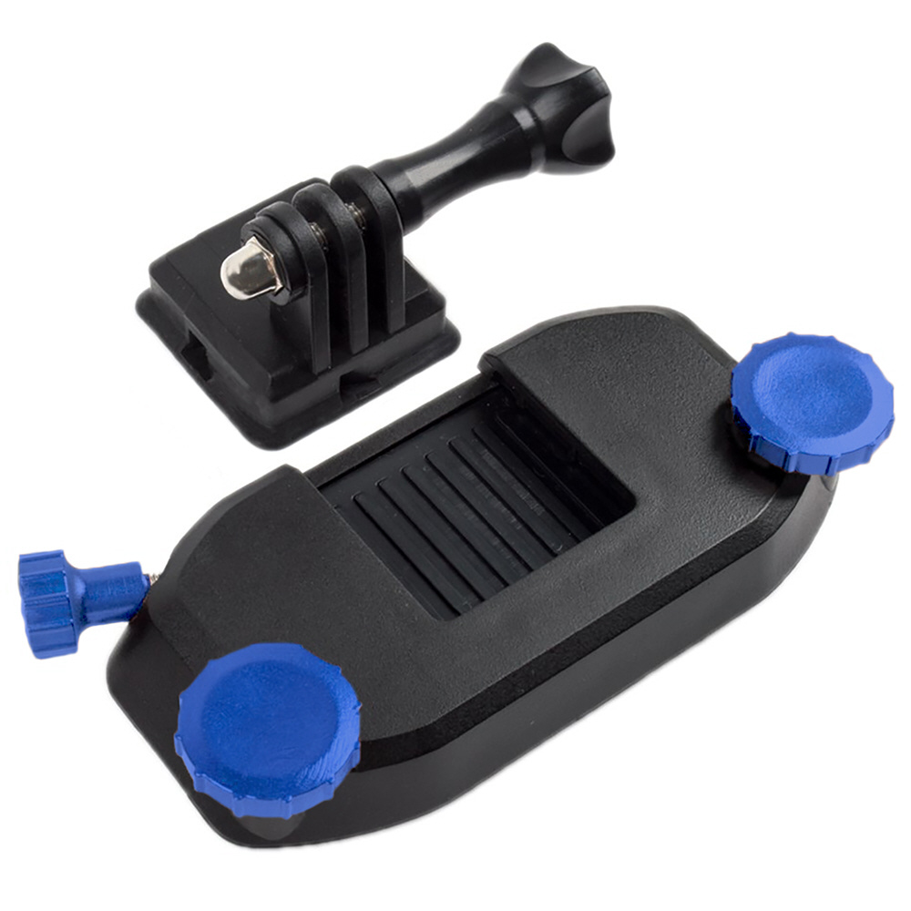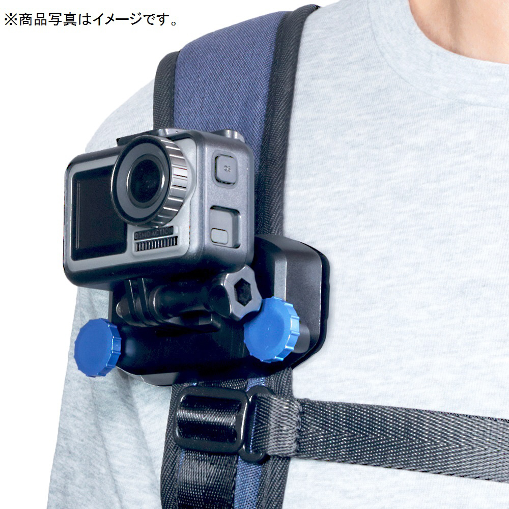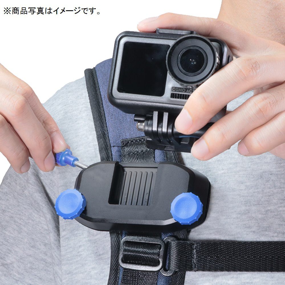 ベース部分はリュックのベルトなどに挟みネジで固定。アクションカメラ用クイックリリースマウント部分はネジで着脱できるようになっています。