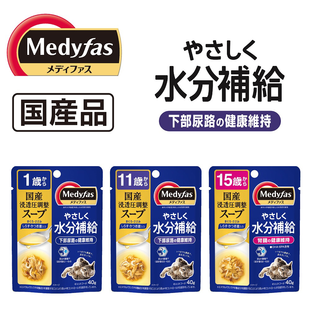 <メディファス>シリーズのスープパウチ。成長段階別の尿ペーハーコントロールで下部尿路の健康維持と浸透圧の調整で水分補給をサポート。しらすとかつお節入り。
