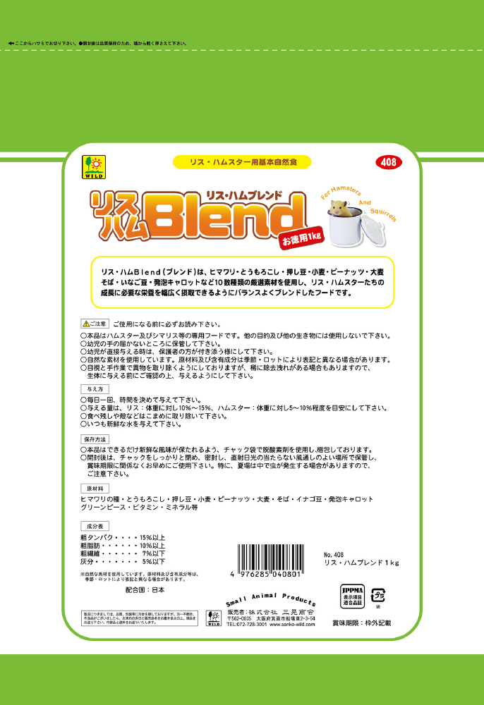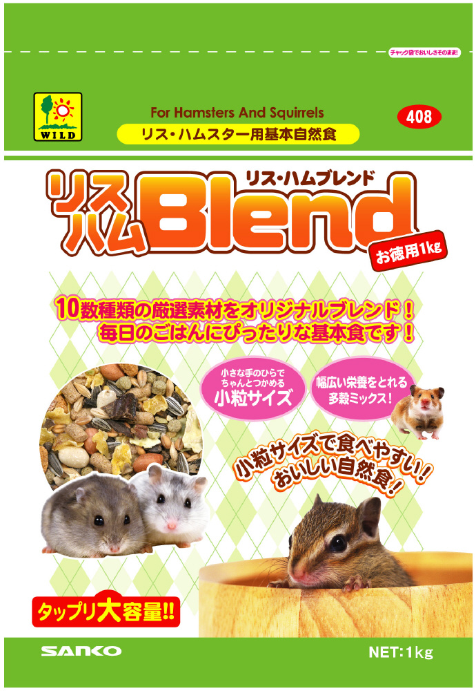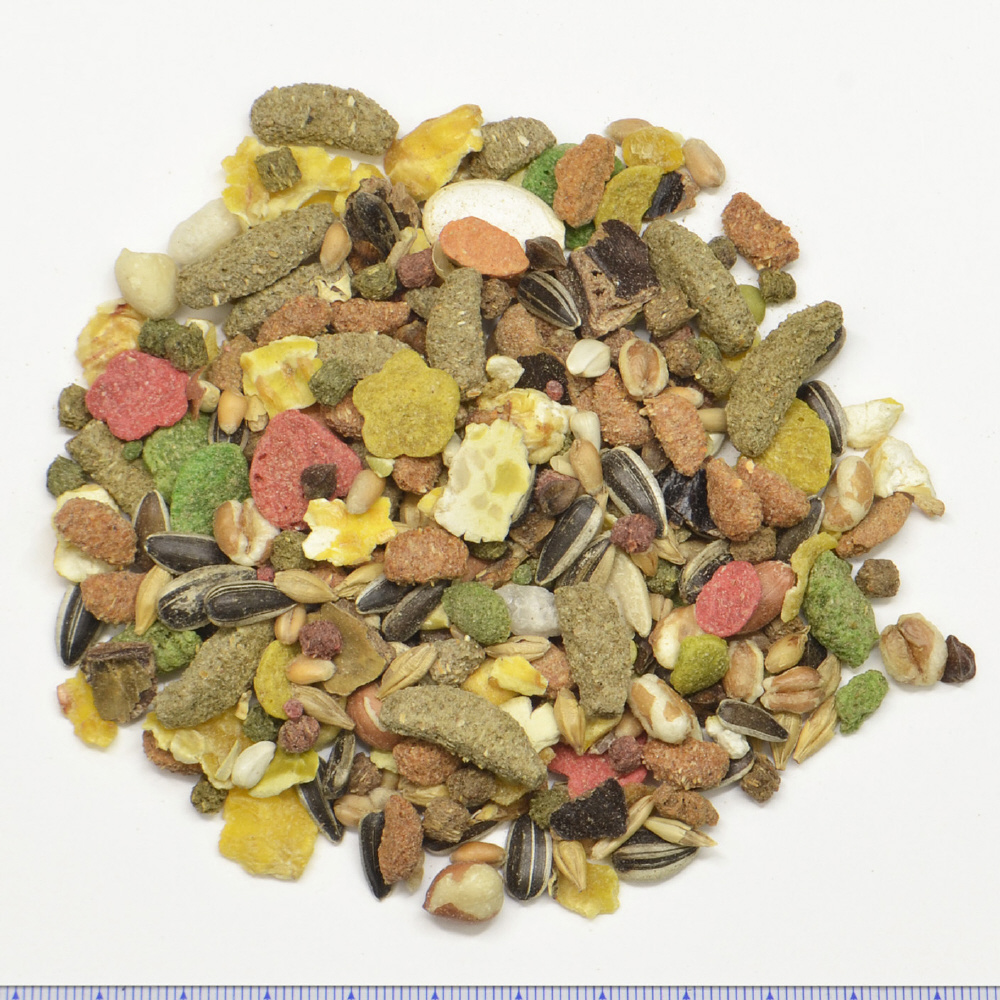 ヒマワリ、トウモロコシ、押し豆、小麦、ピーナッツ、大麦、そば、イナゴ豆、発泡キャロットなど10数種の厳選素材を使用。リスハムスターたちの成長や健康維持に必要な栄養を幅広く摂取できるバランスよくブレンドしたメインフード。