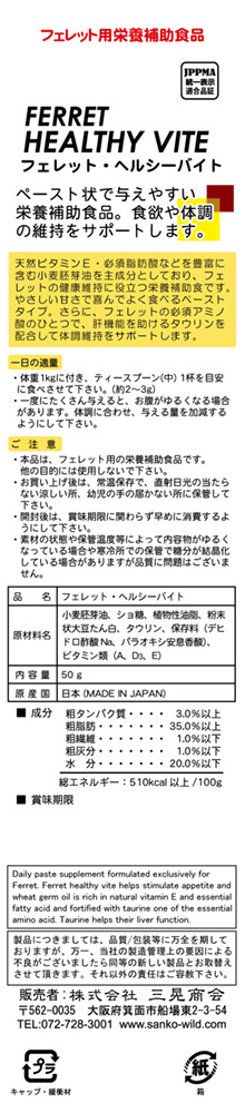 ・フェレット・ヘルシーバイトは、ビタミンE・F・必須脂肪酸など天然ビタミンを豊富に含む小麦胚芽油を主成分としており、フェレットの健康な体づくりに役立ちます。