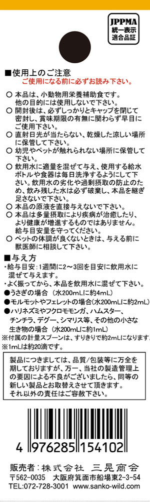 ハリネズミやフクロモモンガ、ハムスター、チンチラ、デグー、シマリス等、その他の小さな生き物の場合:水200mLに約1mL