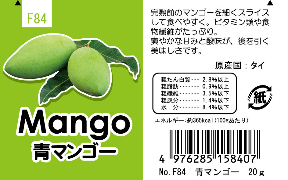完熟前のマンゴーを細くスライスして食べやすく。ビタミン類や食物繊維がたっぷり。爽やかな甘みと酸味が、後を引く美味しさです。