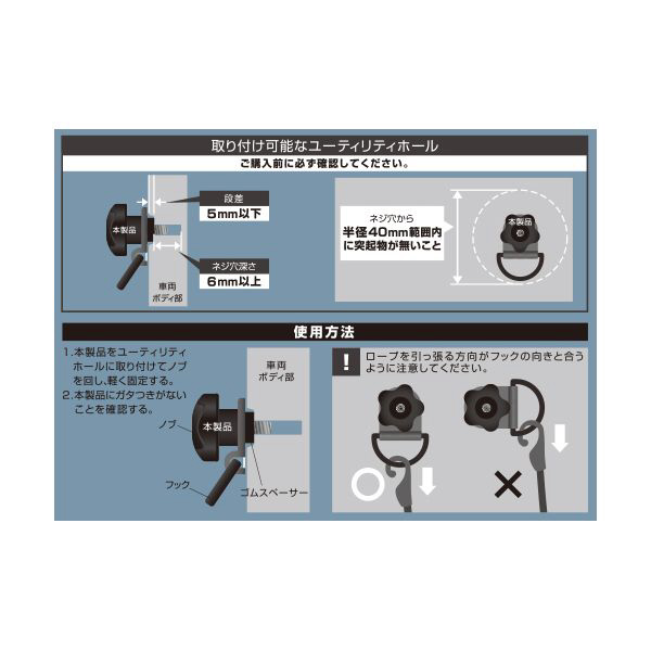 ●車両のM6サイズ用ユーティリティホールを利用して増設できるフック