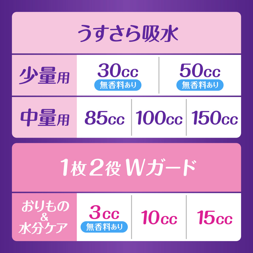 ヨレ防止スリムシート!とてもうすいのに、ヨレにくい。模様の中は センター吸収ゾーン超スピード消臭技術!いやなにおいを中和する技術で、吸水後のにおいもすぐに消臭!横モレ防止ギャザー!横モレもしっかりガードするから安心!生理用ナプキンではありません。吸水ケア,吸水