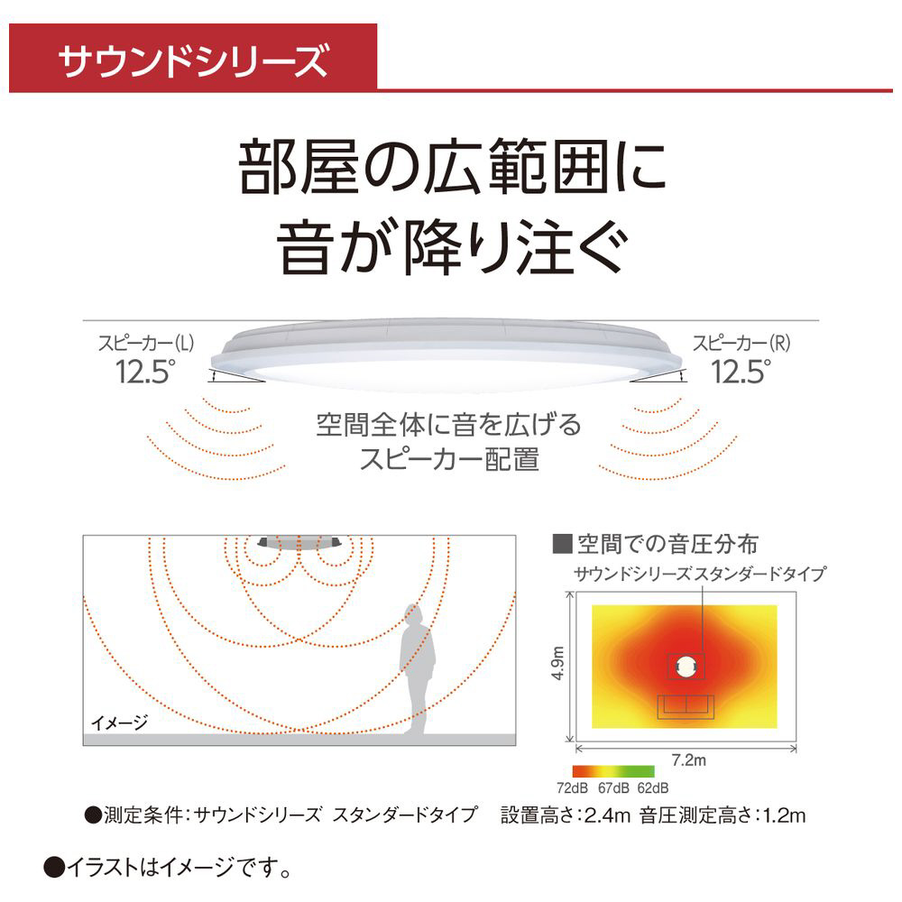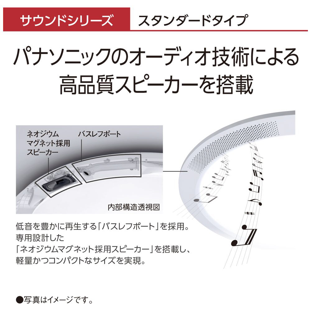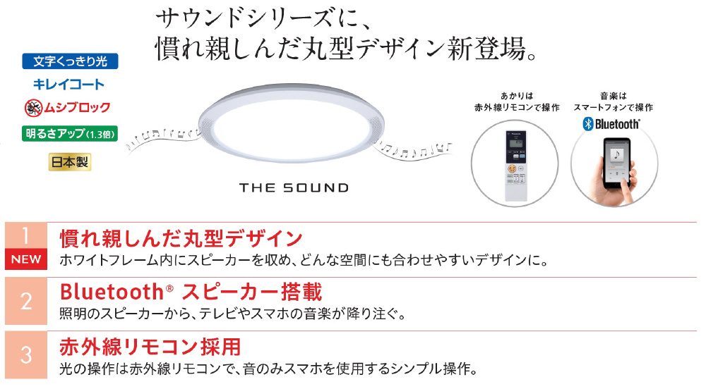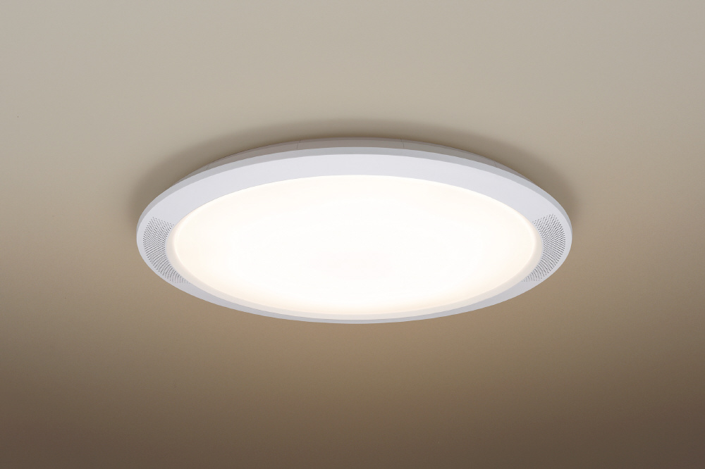 慣れ親しんだ丸型デザイン。厚さ90mmの薄型で天井にすっきり溶け込む。Bluetoothスピーカー搭載でテレビなどの音声を天井から再生、光と音に包まれる新体験を演出。よりシンプルな操作を可能にする赤外線リモコン対応 。汚れがつきにくくお手入れらくらく「キレイコート」。小さな文字もくっきり読みやすい「文字くっきり光」搭載。